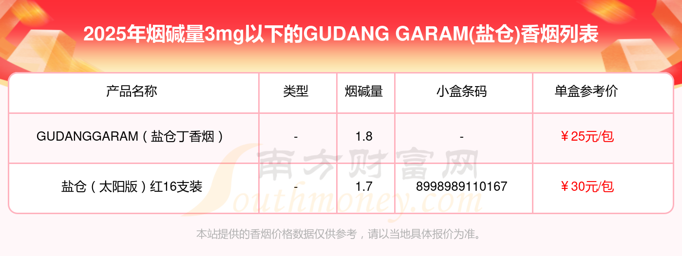 擇煙網(wǎng)為大家盤點了煙堿量3mg以下的GUDANG GARAM(鹽倉)香煙,有GUDANGGARAM(鹽倉丁香煙)、鹽倉(太陽版)紅16支裝等,詳細價格如下:
