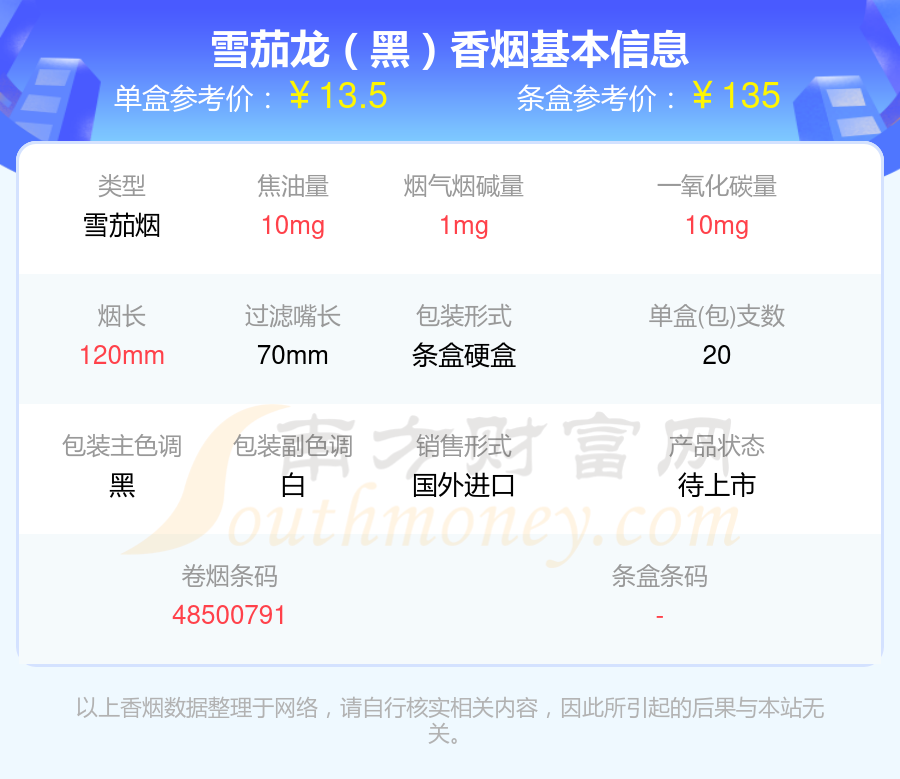 雪茄龍(黑)參考價(jià)13.5元/包、雪茄龍(總裁6mg)參考價(jià)53.0元/包等。
