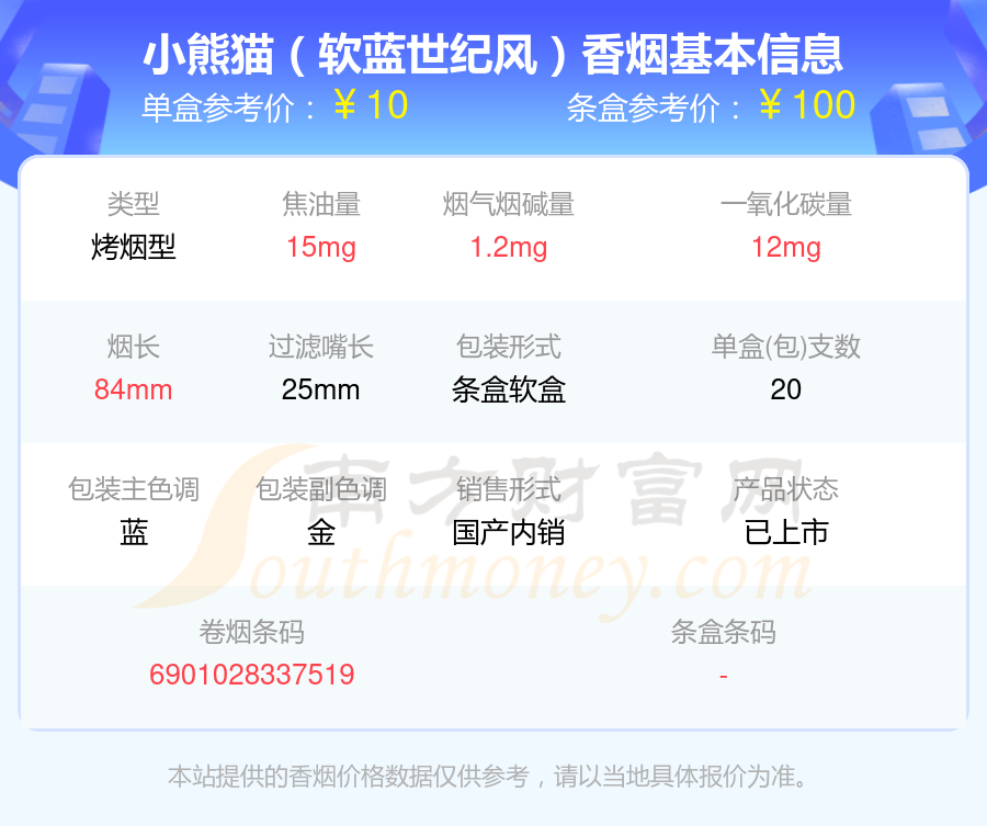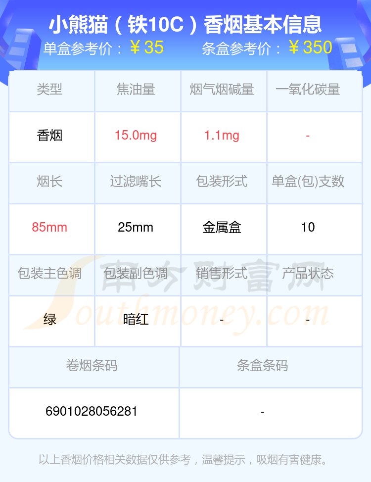 小熊貓香煙焦油量15mg以上的煙分別有小熊貓(鐵10C)參考價35.0元/包、小熊貓(軟藍世紀風)參考價10元/包等。