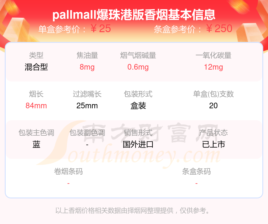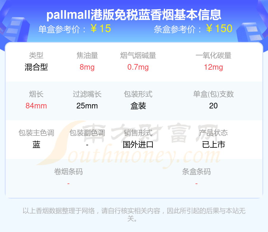pallmall爆珠港版參考價(jià)25元/包、pallmall港版免稅藍(lán)參考價(jià)15元/包等。