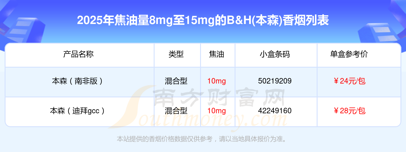 B&H(本森)香煙焦油量8mg至15mg的煙有哪些?擇煙網(wǎng)為大家整理提供,分別有:本森(南非版)、本森(迪拜gcc)等,具體價(jià)格如下: