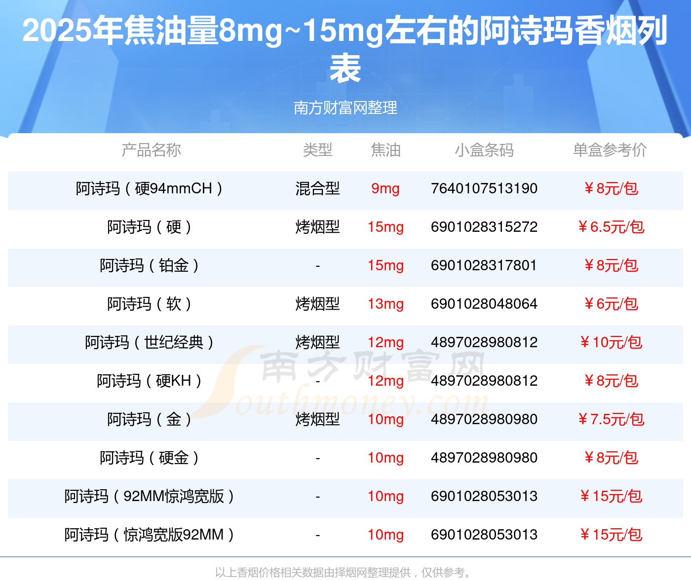 擇煙網(wǎng)為大家盤點(diǎn)了焦油量8mg~15mg左右的阿詩瑪香煙,有阿詩瑪(硬94mmCH)、阿詩瑪(硬)、阿詩瑪(鉑金)、阿詩瑪(軟)、阿詩瑪(世紀(jì)經(jīng)典)、阿詩瑪(硬KH)、阿詩瑪(金)、阿詩瑪(硬金)、阿詩瑪(92MM驚鴻寬版)、阿詩瑪(驚鴻寬版92MM)等,詳細(xì)價格如下: