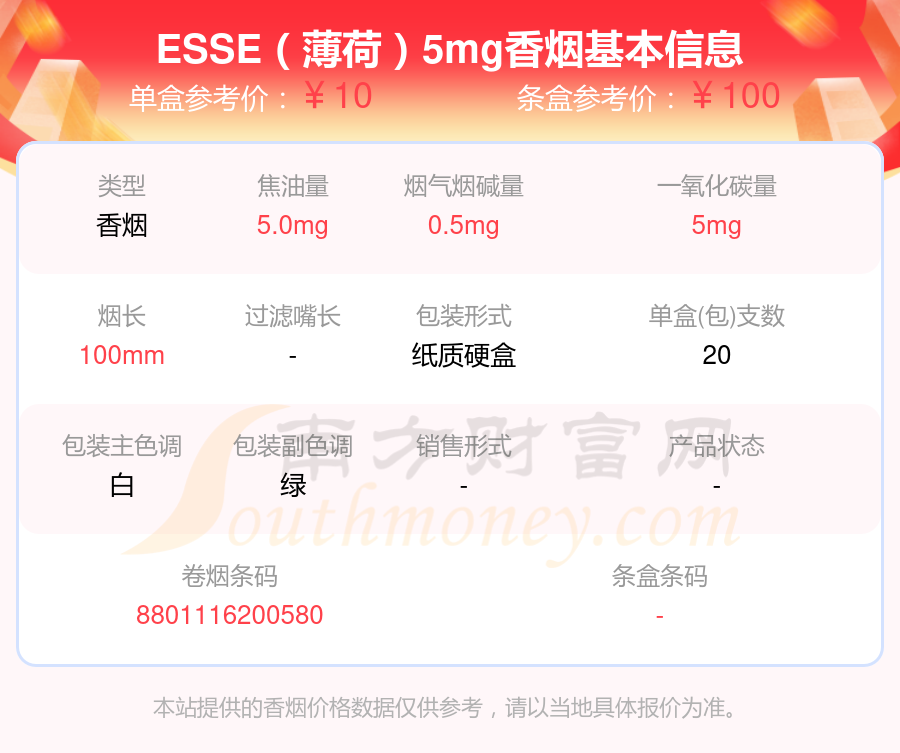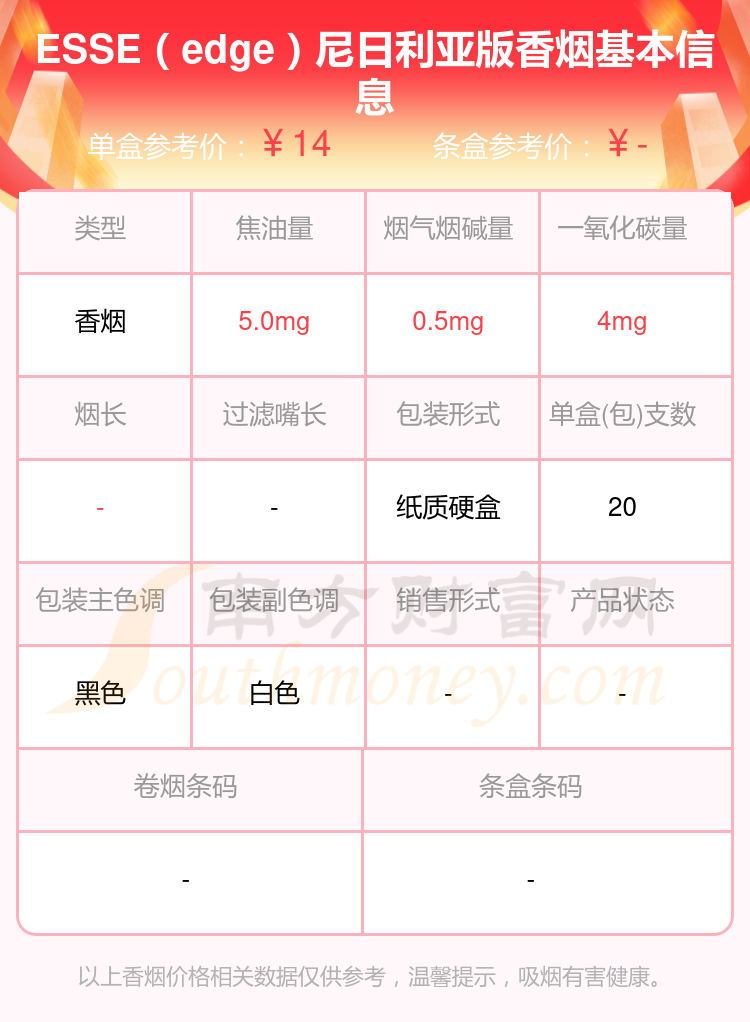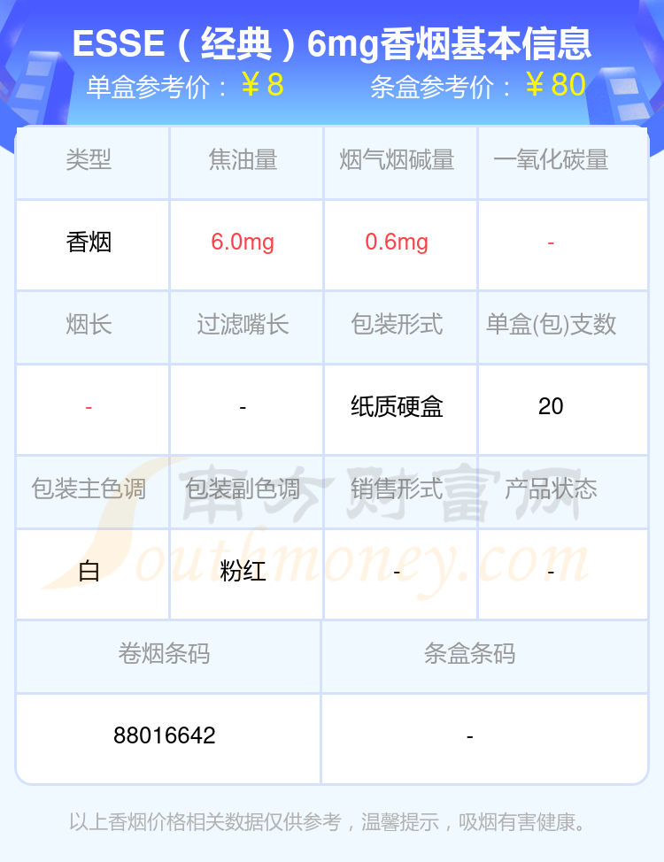 擇煙網(wǎng)為大家盤點(diǎn)了ESSE(愛喜)香煙尼古丁低于4mg的,分別有愛喜(金)、ESSE(經(jīng)典)6mg、愛喜(經(jīng)典)、ESSE(Aura蘋果)中國(guó)免稅版、愛喜(藍(lán))、ESSE(edge)尼日利亞版、ESSE(薄荷)5mg、愛喜(薄荷)、愛喜(藍(lán)特醇免稅韓版)、愛喜(銀松)等,具體價(jià)格如下: