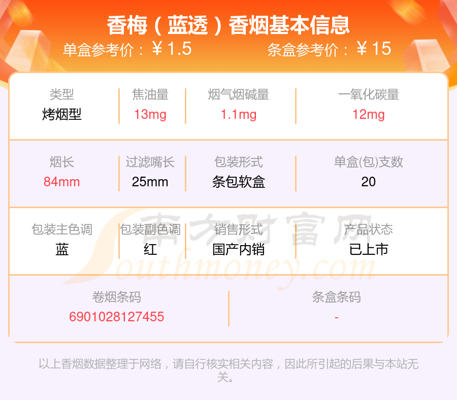 擇煙網(wǎng)為大家盤點(diǎn)了香梅香煙煙堿3mg以下的,分別有香梅(藍(lán)透)、香梅(紅透滿堂)等,詳細(xì)價(jià)格如下:
