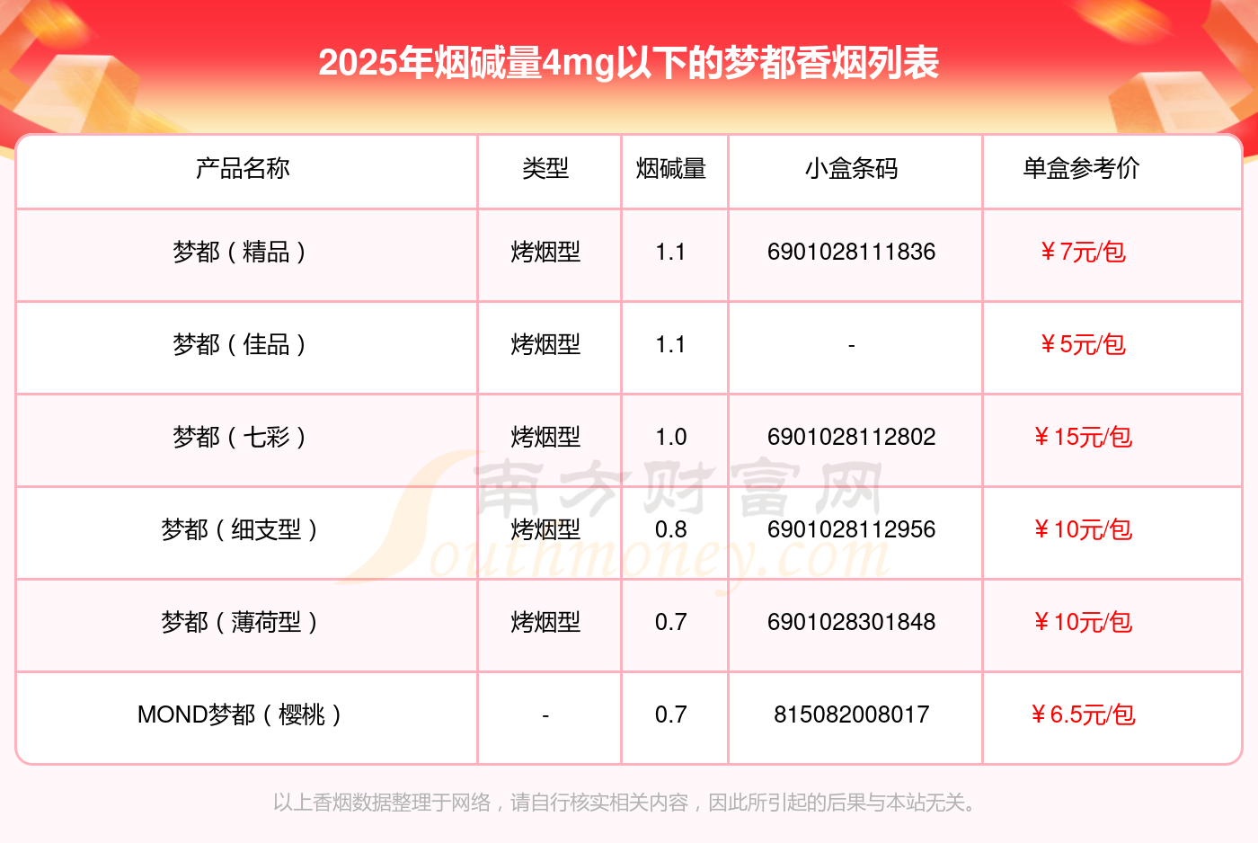 擇煙網(wǎng)為大家盤點(diǎn)了煙堿量4mg以下的夢(mèng)都香煙,有夢(mèng)都(精品)、夢(mèng)都(佳品)、夢(mèng)都(七彩)、夢(mèng)都(細(xì)支型)、夢(mèng)都(薄荷型)、MOND夢(mèng)都(櫻桃)等,詳細(xì)價(jià)格如下: