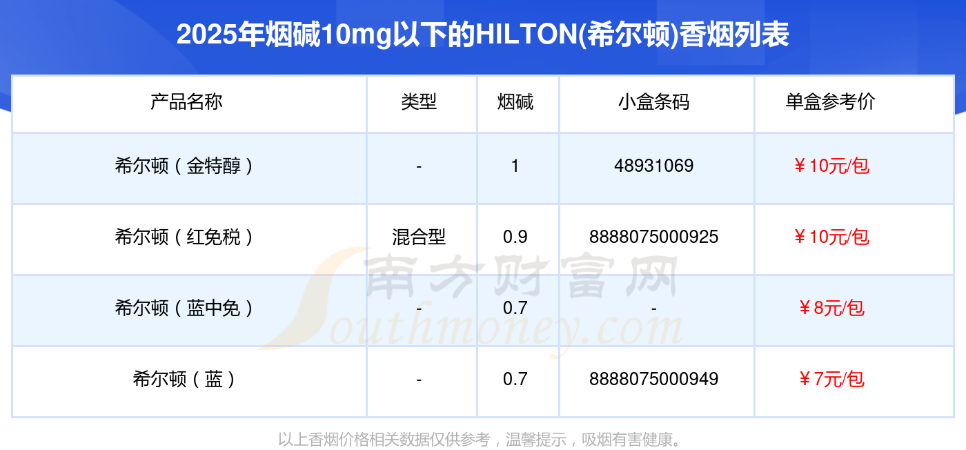 擇煙網(wǎng)為大家盤(pán)點(diǎn)了煙堿10mg以下的HILTON(希爾頓)香煙,有希爾頓(金特醇)、希爾頓(紅免稅)、希爾頓(藍(lán)中免)、希爾頓(藍(lán))等,詳細(xì)價(jià)格如下: