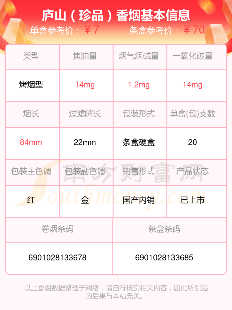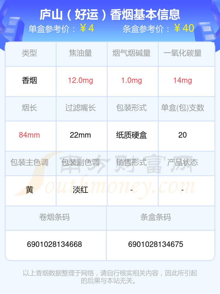 廬山(佳品)參考價(jià)5元/包、廬山(珍品)參考價(jià)7元/包、廬山(鴻運(yùn))參考價(jià)6元/包、廬山(好運(yùn))參考價(jià)4.0元/包、廬山(黃精品)參考價(jià)5.0元/包、廬山(精品)參考價(jià)5.0元/包等。