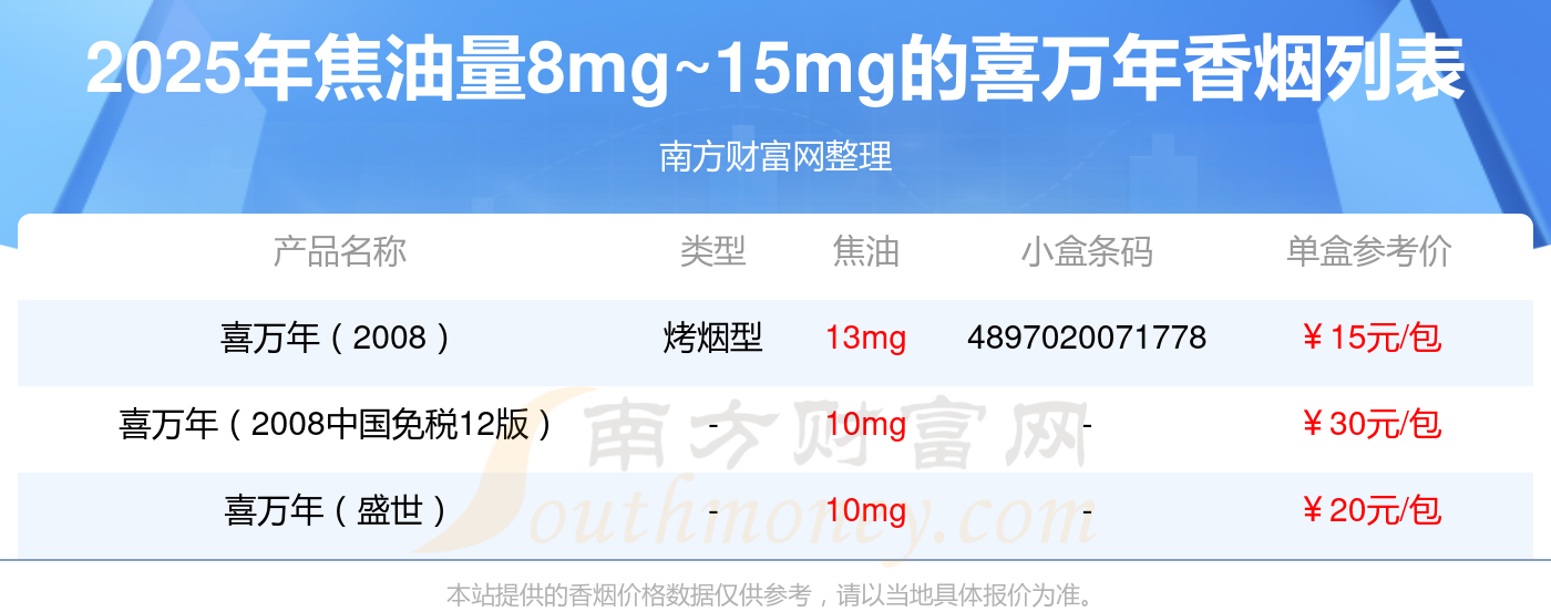 擇煙網(wǎng)為大家盤點(diǎn)了喜萬(wàn)年香煙焦油量8mg~15mg的煙,有以下這些: