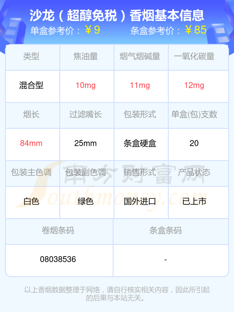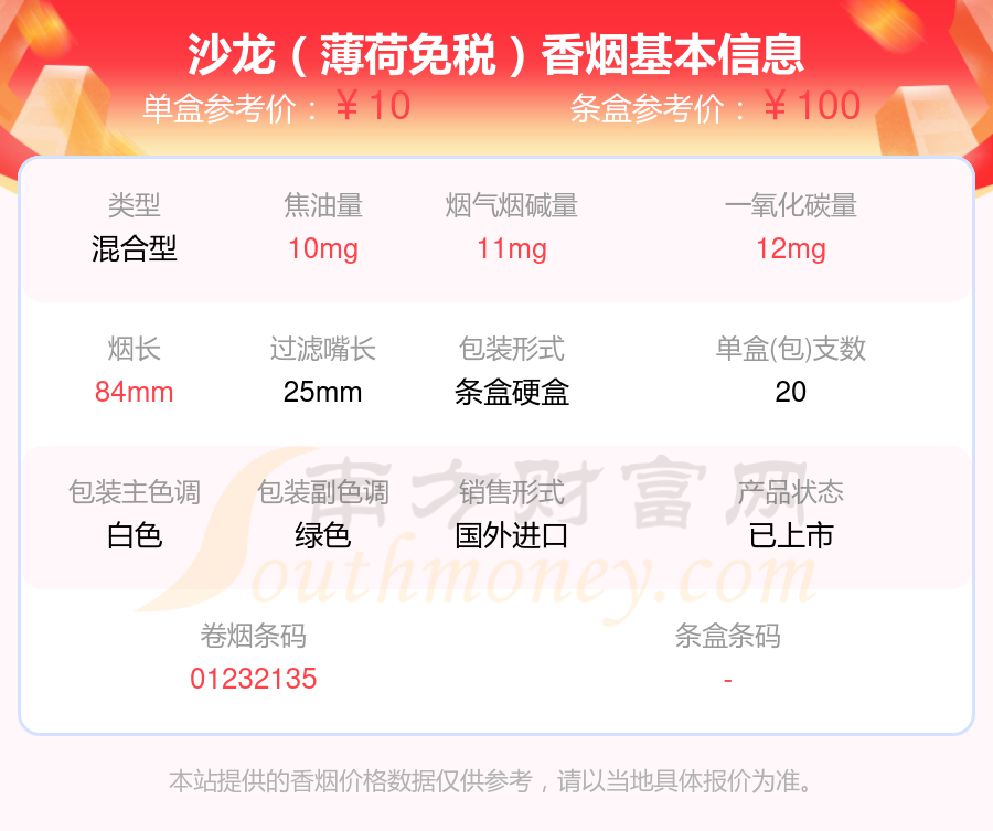 沙龍(薄荷免稅)參考價10元/包、沙龍(超醇免稅)參考價9元/包等。
