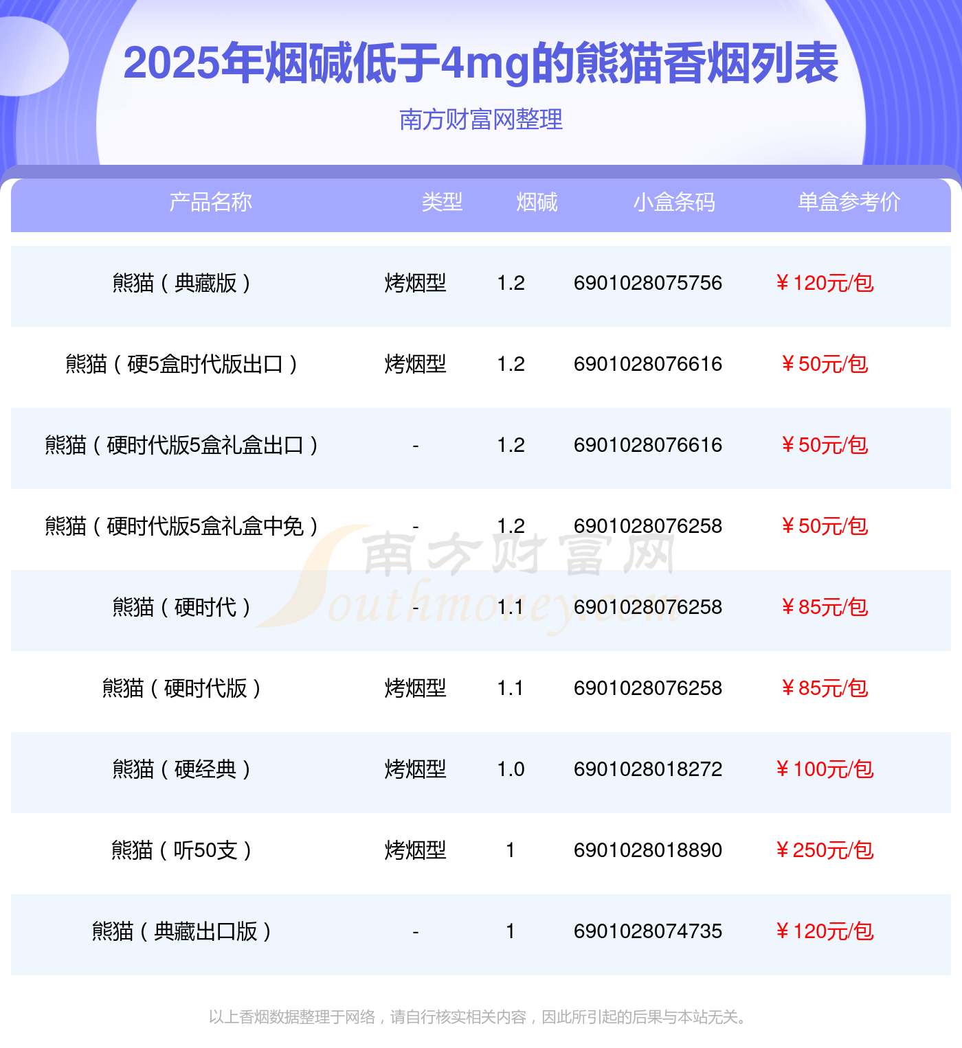擇煙網(wǎng)為大家盤點了煙堿低于4mg的熊貓香煙,分別有熊貓(典藏版)、熊貓(硬5盒時代版出口)、熊貓(硬時代版5盒禮盒出口)、熊貓(硬時代版5盒禮盒中免)、熊貓(硬時代)、熊貓(硬時代版)、熊貓(硬經(jīng)典)、熊貓(聽50支)、熊貓(典藏出口版)等,具體價格如下: