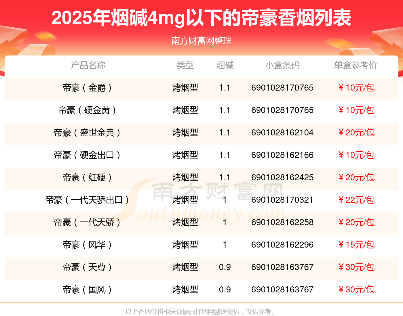 帝豪香煙煙堿4mg以下的煙分別有帝豪(金爵)參考價10元/包、帝豪(硬金黃)參考價10元/包、帝豪(盛世金典)參考價20元/包、帝豪(硬金出口)參考價10元/包、帝豪(紅硬)參考價20元/包、帝豪(一代天驕出口)參考價22元/包、帝豪(一代天驕)參考價20元/包、帝豪(風華)參考價15元/包、帝豪(天尊)參考價30元/包、帝豪(國風)參考價30元/包等。