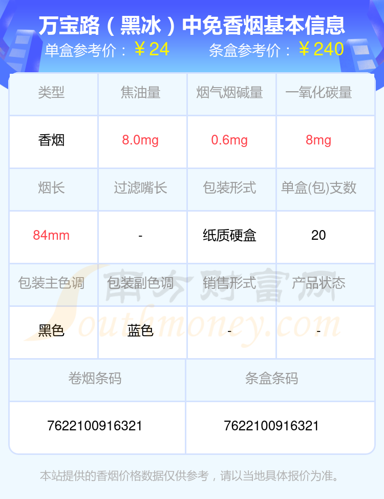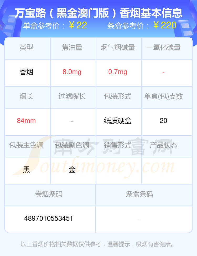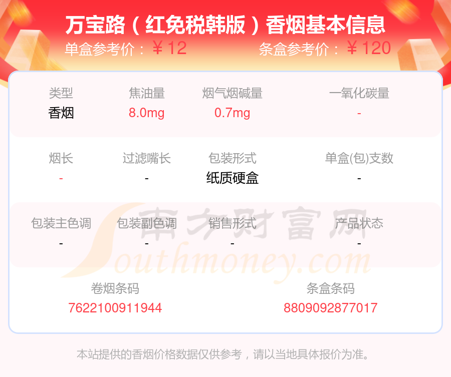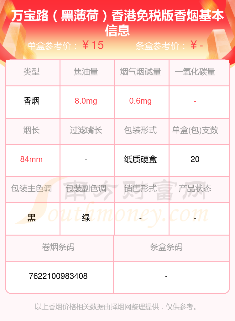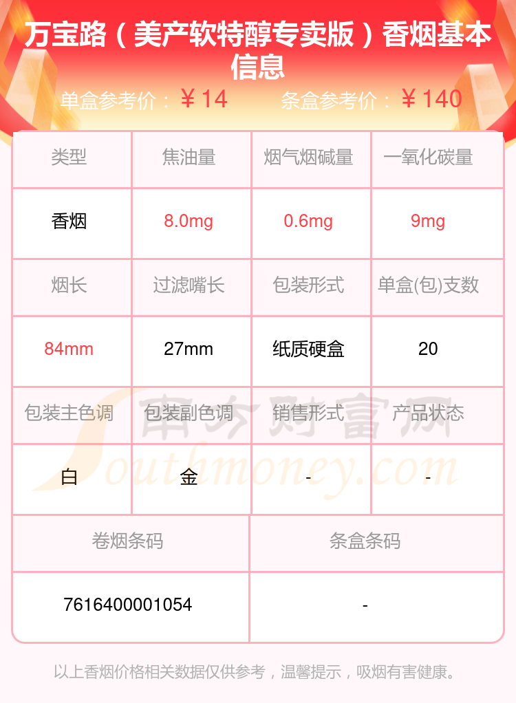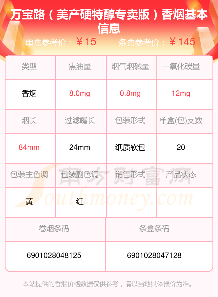萬寶路(薄荷免稅港版)參考價(jià)29.0元/包、萬寶路(黑冰)中免參考價(jià)24.0元/包、萬寶路(鐵盒金特醇港版)參考價(jià)30.0元/包、萬寶路(黑金澳門版)參考價(jià)22.0元/包、萬寶路(綠中免)參考價(jià)12.0元/包、萬寶路(美產(chǎn)軟特醇專賣版)參考價(jià)14.0元/包、萬寶路(美產(chǎn)硬特醇專賣版)參考價(jià)15.0元/包、萬寶路(綠港版)參考價(jià)15.0元/包、萬寶路(紅免稅韓版)參考價(jià)12.0元/包、萬寶路(黑薄荷)香港免稅版參考價(jià)15.0元/包等。