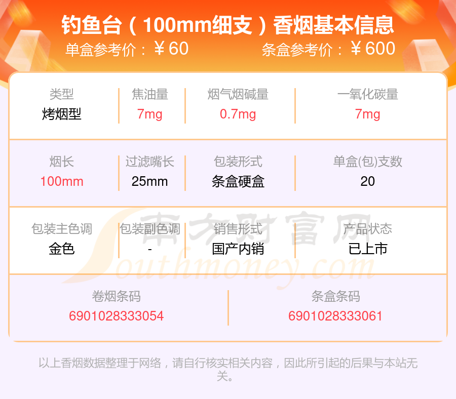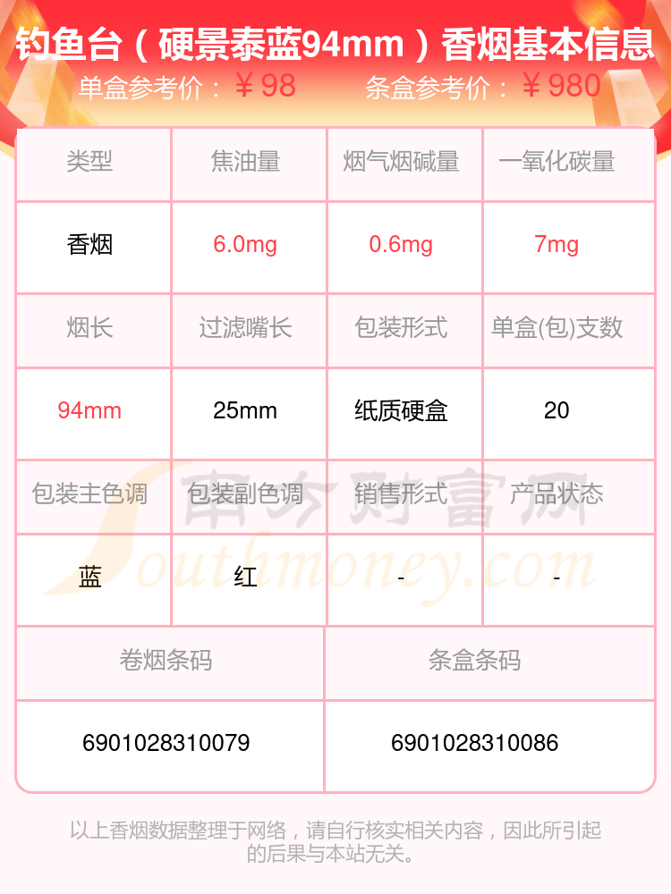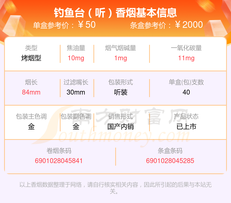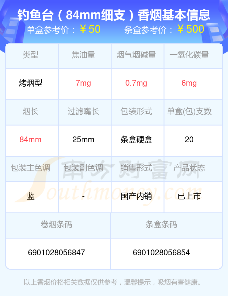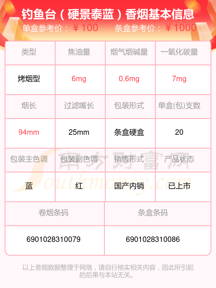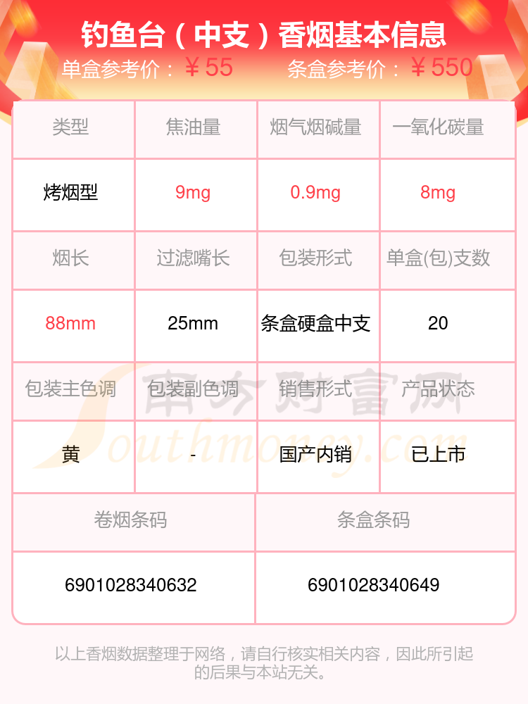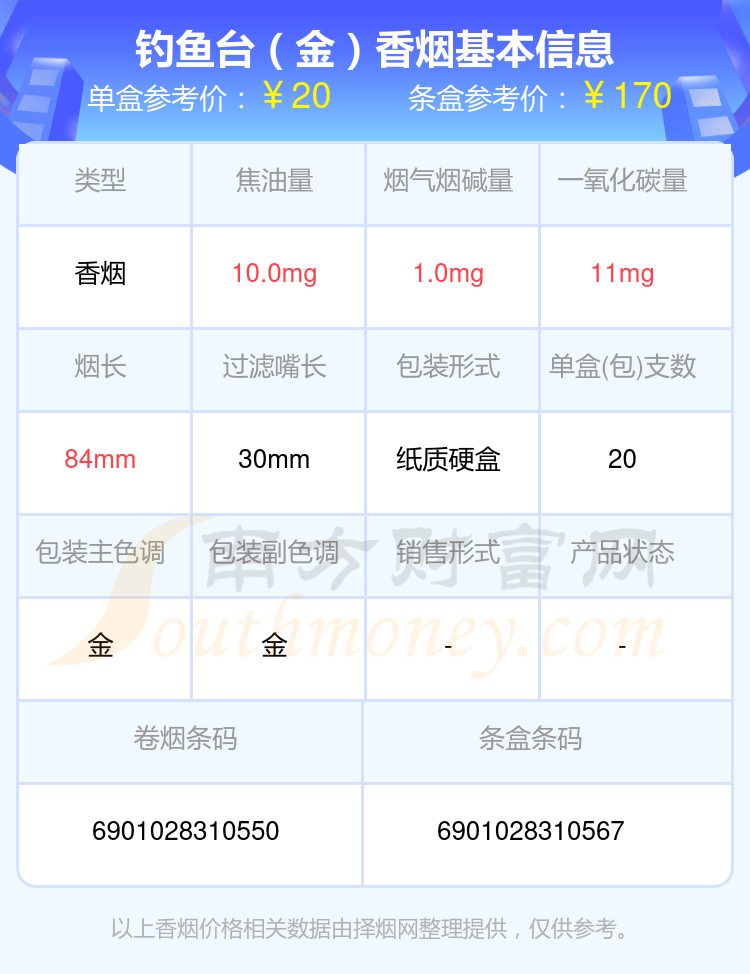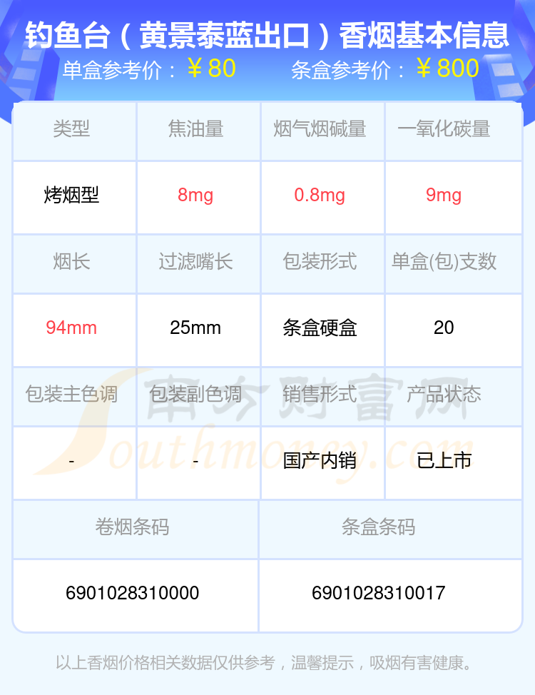 釣魚(yú)臺(tái)(中支)參考價(jià)55元/包、釣魚(yú)臺(tái)(黃景泰藍(lán)出口)參考價(jià)80元/包、釣魚(yú)臺(tái)(84mm細(xì)支)參考價(jià)50元/包、釣魚(yú)臺(tái)(100mm細(xì)支)參考價(jià)60元/包、釣魚(yú)臺(tái)(硬景泰藍(lán)94mm)參考價(jià)98.0元/包、釣魚(yú)臺(tái)(硬景泰藍(lán))參考價(jià)100元/包、釣魚(yú)臺(tái)(金)參考價(jià)20.0元/包、釣魚(yú)臺(tái)(聽(tīng))參考價(jià)50元/包等。