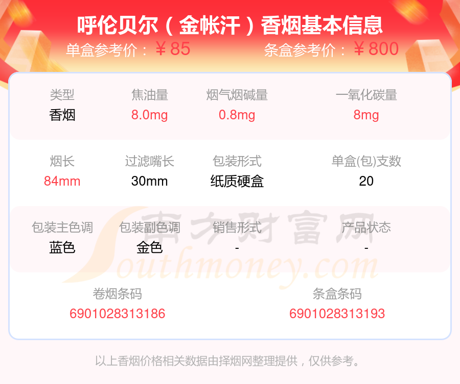 呼倫貝爾(金帳汗)參考價85.0元/包、呼倫貝爾(金戈鐵馬)參考價50.0元/包、呼倫貝爾(金)參考價100.0元/包等。