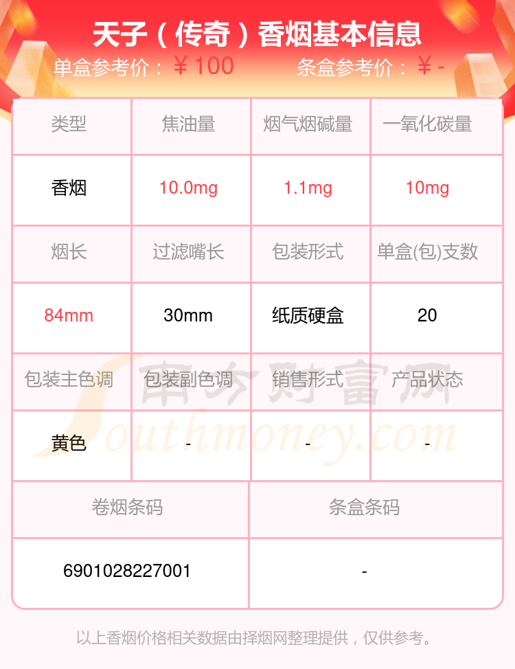 100元以上的天子香煙有哪些?擇煙網(wǎng)為大家整理盤點,有天子(黃)、天子(重慶20年)、天子(觀天下長嘴中支)、天子(千里江山中支)、天子(傳奇)、天子(觀天下)、天子(一言九鼎)等,詳細價格如下:
