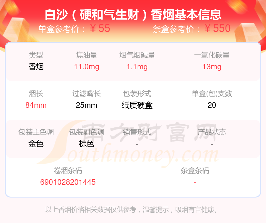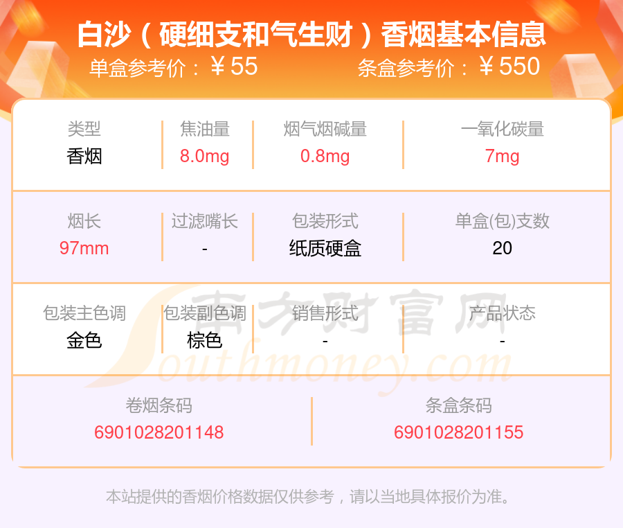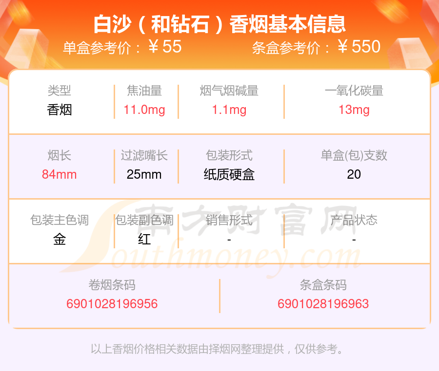 擇煙網(wǎng)為大家盤點(diǎn)了50元至60元的白沙香煙,分別有白沙(和鉆石)、白沙(硬細(xì)支和氣生財(cái))、白沙(硬和氣生財(cái))等,具體價(jià)格如下: