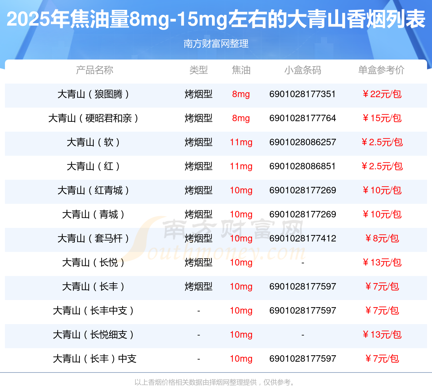 大青山香煙焦油量8mg-15mg左右的煙有大青山(狼圖騰)、大青山(硬昭君和親)、大青山(軟)、大青山(紅)、大青山(紅青城)、大青山(青城)、大青山(套馬桿)、大青山(長悅)、大青山(長豐)、大青山(長豐中支)等,詳細(xì)價格如下: