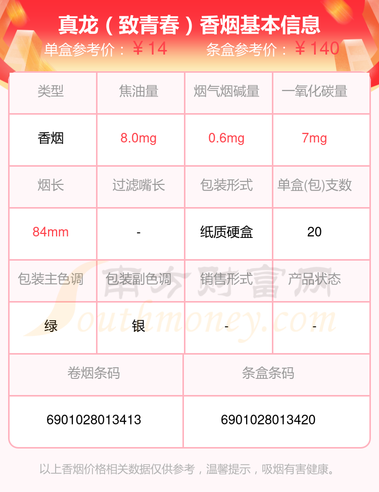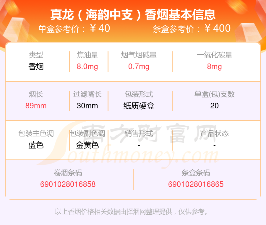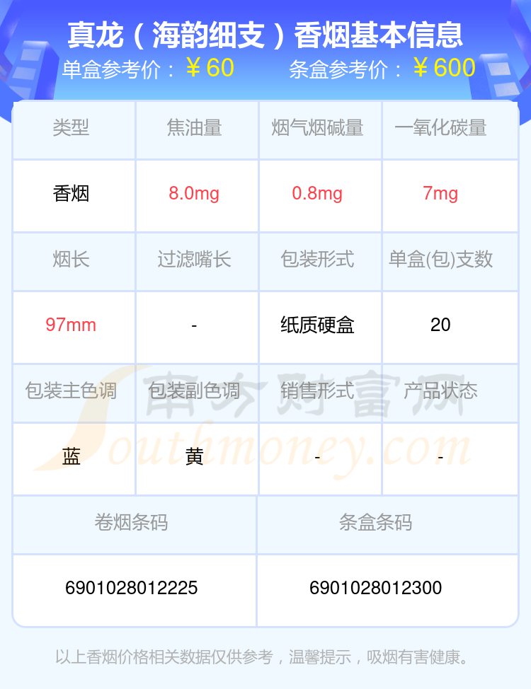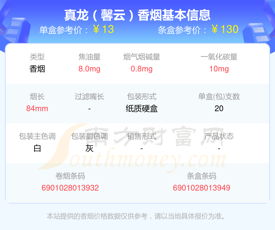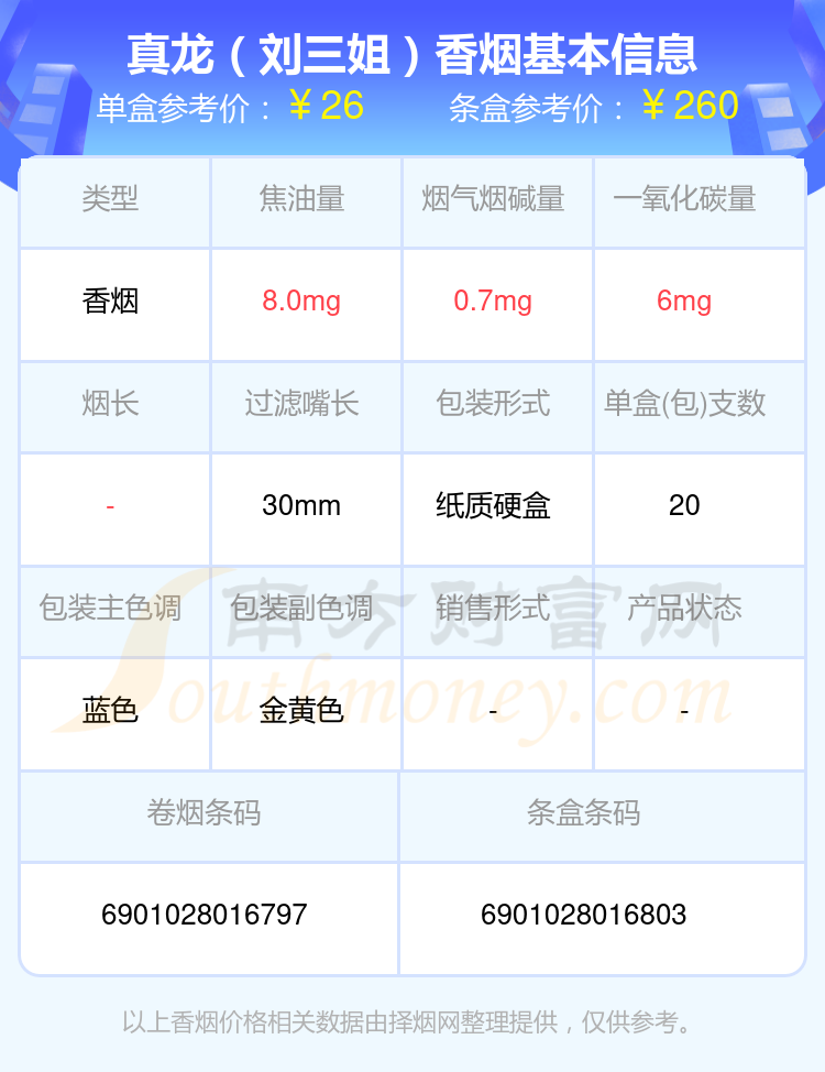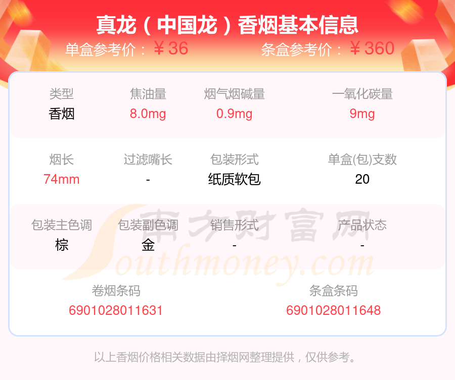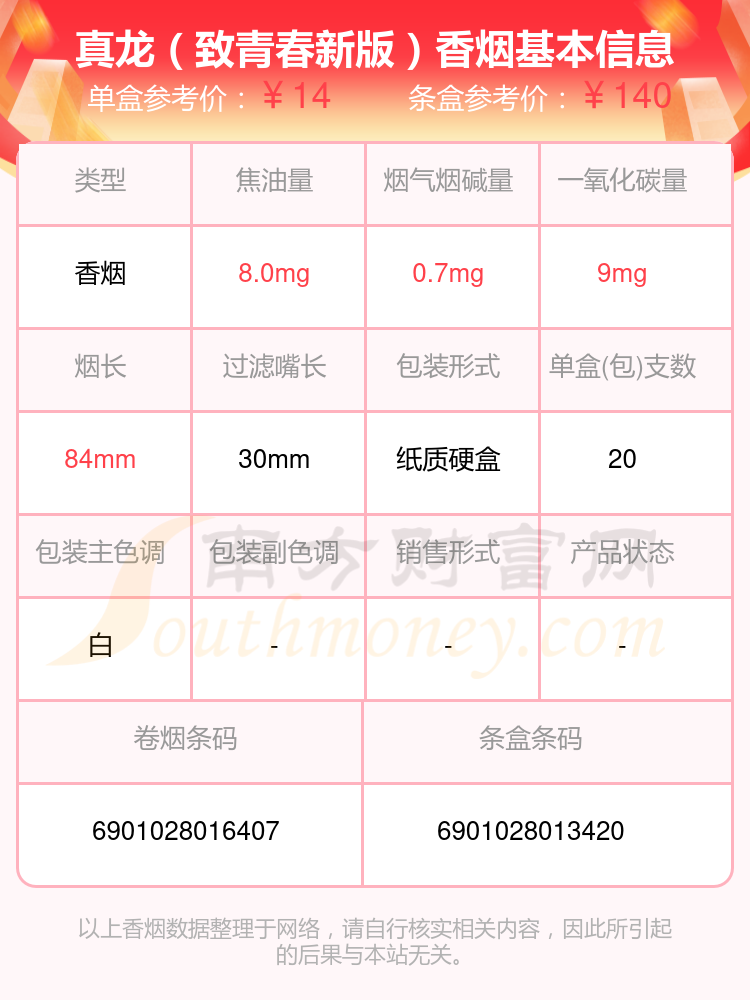 真龍(海韻中支)參考價40.0元/包、真龍(海韻細支)參考價60.0元/包、真龍(致青春)參考價14.0元/包、真龍(劉三姐)參考價26.0元/包、真龍(馨云)參考價13.0元/包、真龍(燃情時光)參考價23.0元/包、真龍(中國龍)參考價36.0元/包、真龍(甲天下)參考價8.0元/包、真龍(凌云)參考價15.0元/包、真龍(致青春新版)參考價14.0元/包等。