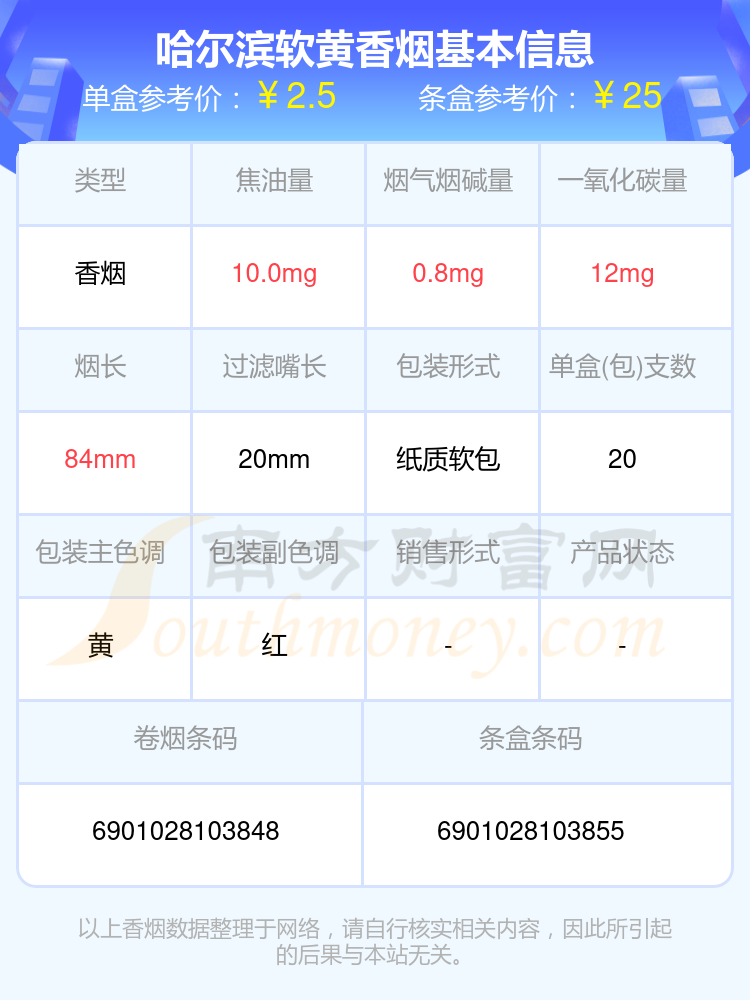 哈爾濱軟黃單盒參考價(jià):2.5元