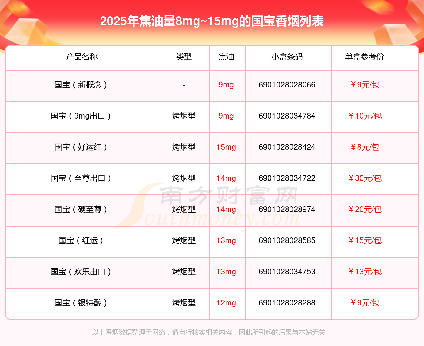 國寶(新概念)參考價9元/包、國寶(9mg出口)參考價10元/包、國寶(好運紅)參考價8元/包、國寶(至尊出口)參考價30.0元/包、國寶(硬至尊)參考價20元/包、國寶(紅運)參考價15元/包、國寶(歡樂出口)參考價13元/包、國寶(銀特醇)參考價9元/包等。
