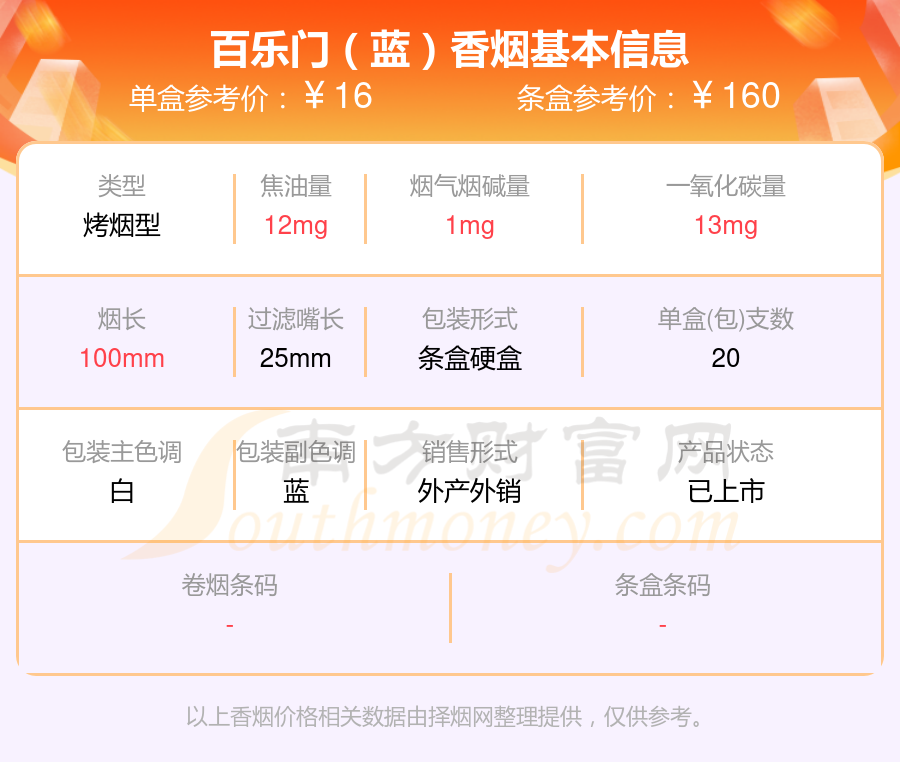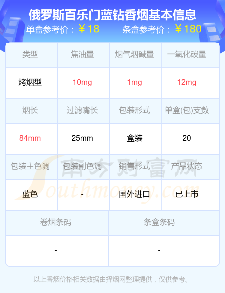 百樂門(普通)參考價(jià)16.0元/包、百樂門(藍(lán))參考價(jià)16元/包、俄羅斯百樂門藍(lán)鉆參考價(jià)18元/包等。