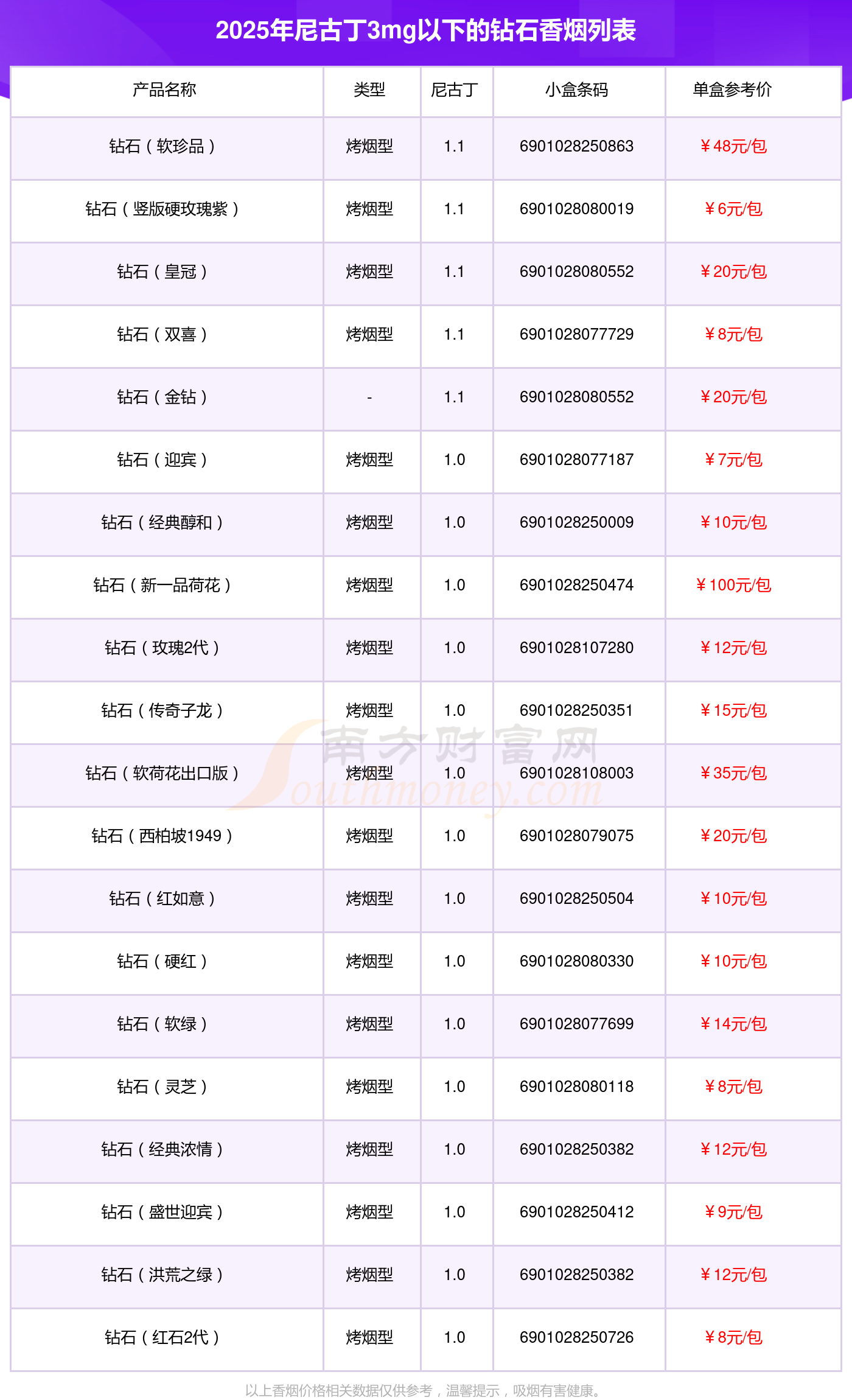 擇煙網(wǎng)為大家盤點了尼古丁3mg以下的鉆石香煙,有以下這些: