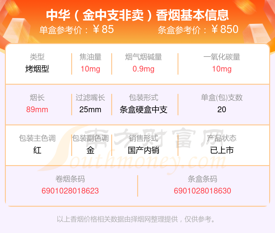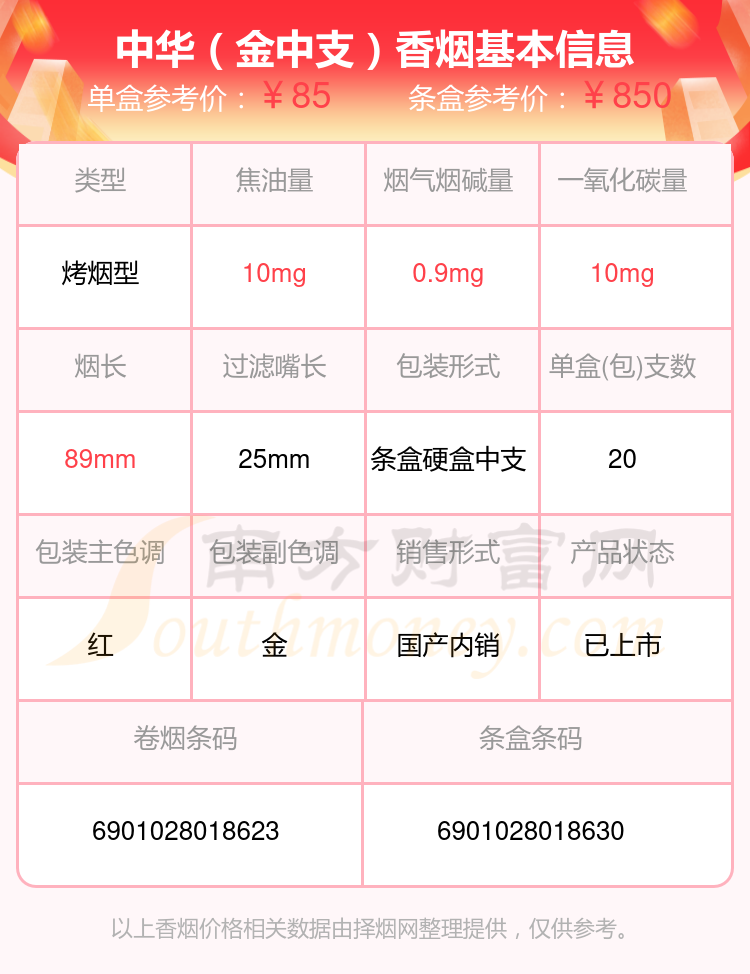 擇煙網(wǎng)為大家盤點(diǎn)了中華香煙70~90元的,分別有中華(金中支)、中華(金短支)、中華(金中支非賣)等,詳細(xì)價(jià)格如下: