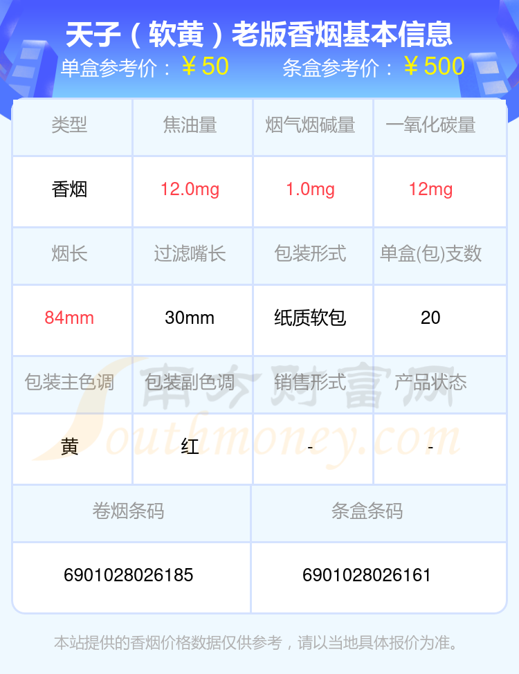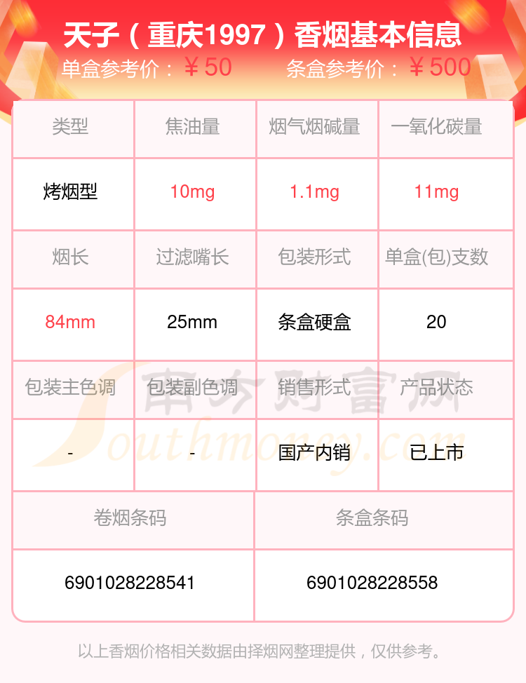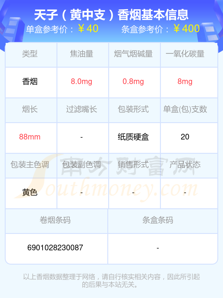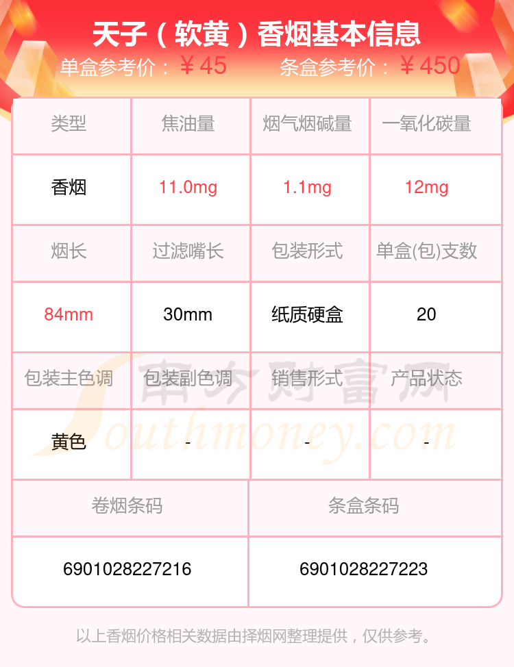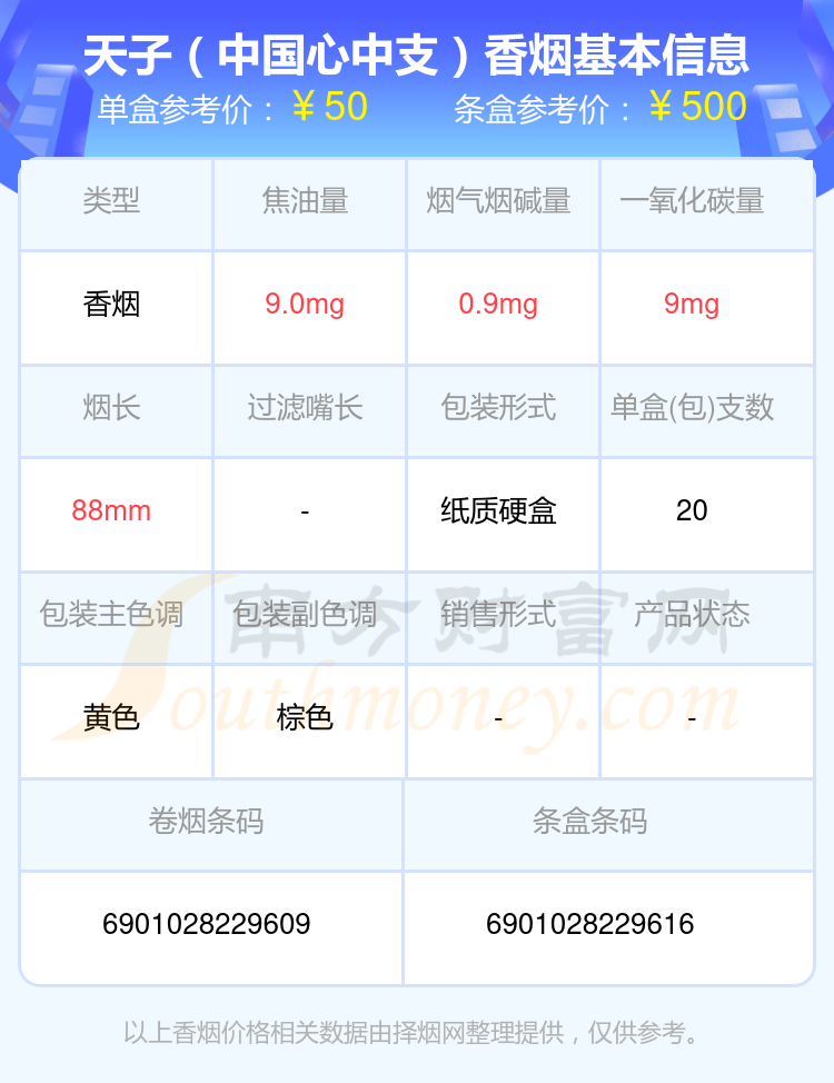 天子(軟黃)老版參考價(jià)50.0元/包、天子(中國心中支)參考價(jià)50.0元/包、天子(細(xì)支傳奇)參考價(jià)50.0元/包、天子(1997)參考價(jià)50.0元/包、天子(重慶1997)參考價(jià)50元/包、天子(傳奇細(xì)支)參考價(jià)50元/包、天子(軟黃)參考價(jià)45.0元/包、天子(黃中支)參考價(jià)40.0元/包、天子(重慶印象)參考價(jià)35.0元/包、天子(千里江山)參考價(jià)35.0元/包等。
