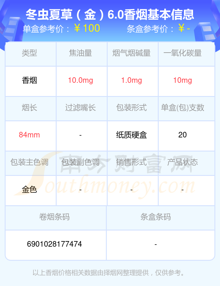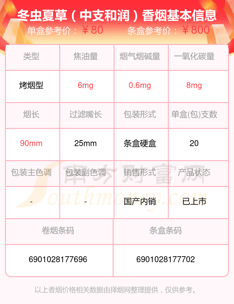 冬蟲(chóng)夏草香煙高于六十元的煙分別有冬蟲(chóng)夏草(中支和潤(rùn))參考價(jià)80元/包、冬蟲(chóng)夏草(1248)參考價(jià)60.0元/包、冬蟲(chóng)夏草(天潤(rùn))參考價(jià)60元/包、冬蟲(chóng)夏草(金)6.0參考價(jià)100.0元/包、冬蟲(chóng)夏草(硬)參考價(jià)100.0元/包、冬蟲(chóng)夏草(金)參考價(jià)100元/包、冬蟲(chóng)夏草(黃金盛世)參考價(jià)100元/包、冬蟲(chóng)夏草(金細(xì))參考價(jià)100元/包、冬蟲(chóng)夏草(慶典)參考價(jià)100元/包等。
