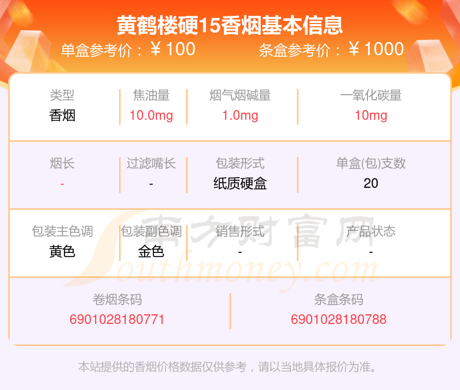 黃鶴樓硬15單盒參考價(jià):100元