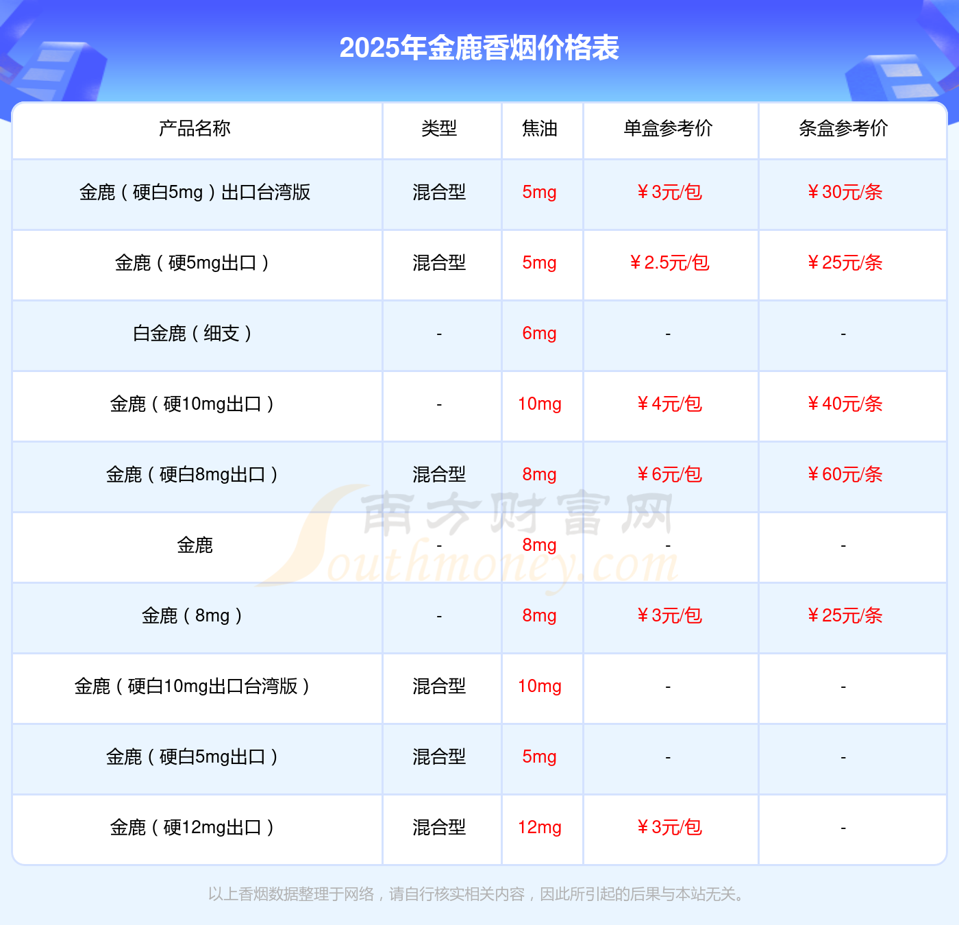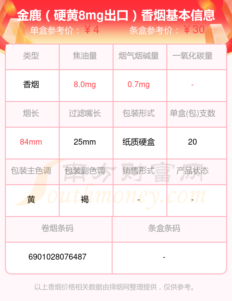 金鹿(硬黃8mg出口)單盒參考價(jià):4元