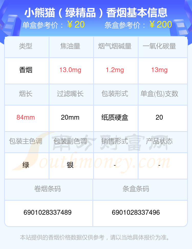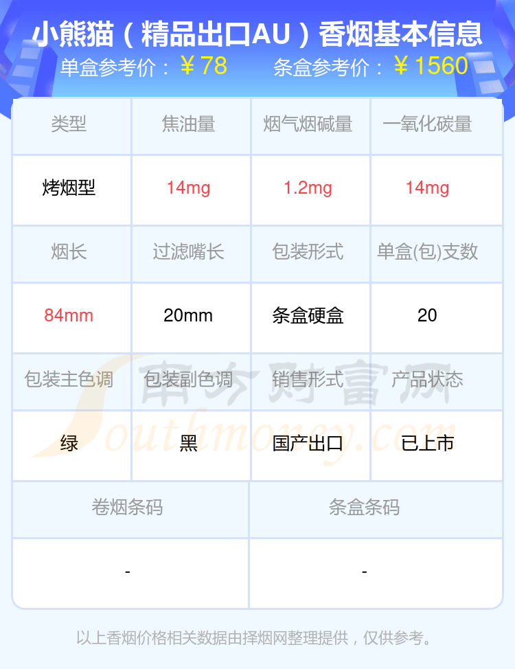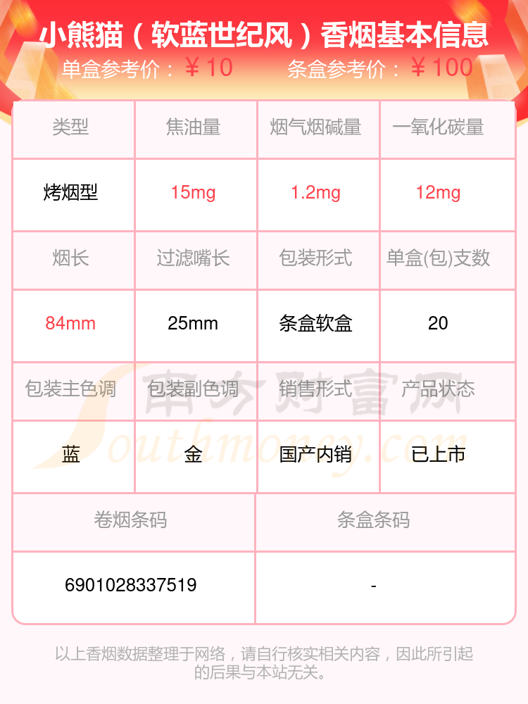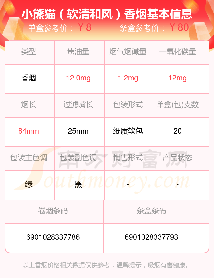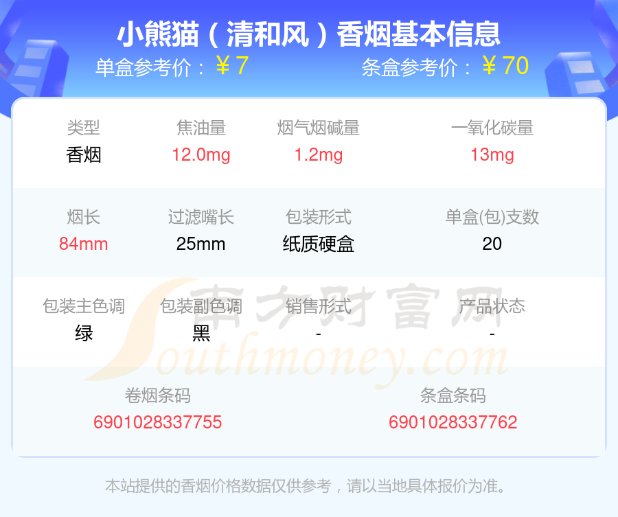 小熊貓(軟精品)參考價(jià)20.0元/包、小熊貓(清和風(fēng))參考價(jià)7.0元/包、小熊貓(綠精品)參考價(jià)20.0元/包、小熊貓(藍(lán)世紀(jì)風(fēng))參考價(jià)10.0元/包、小熊貓(軟藍(lán)世紀(jì)風(fēng))參考價(jià)10元/包、小熊貓(精品塑盒裝)參考價(jià)20元/包、小熊貓(紅世紀(jì)風(fēng))參考價(jià)10.0元/包、小熊貓(精品)參考價(jià)20.0元/包、小熊貓(精品出口AU)參考價(jià)78元/包、小熊貓(軟清和風(fēng))參考價(jià)8.0元/包等。