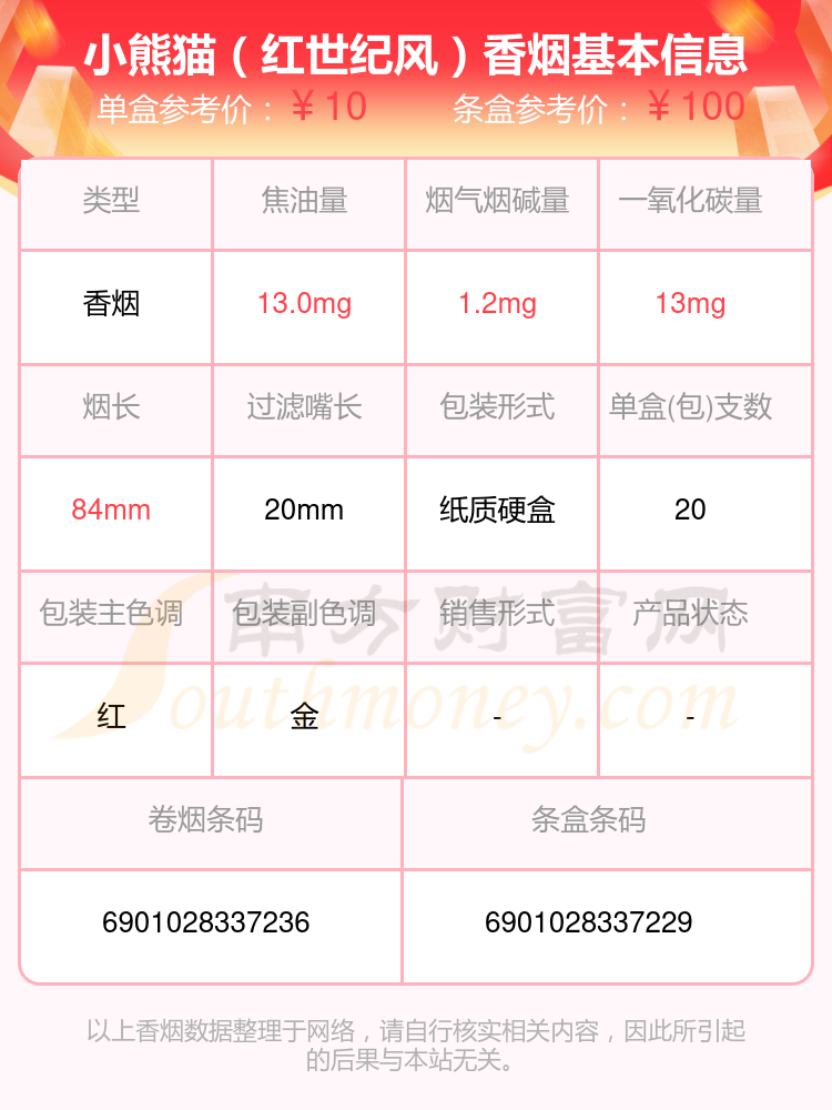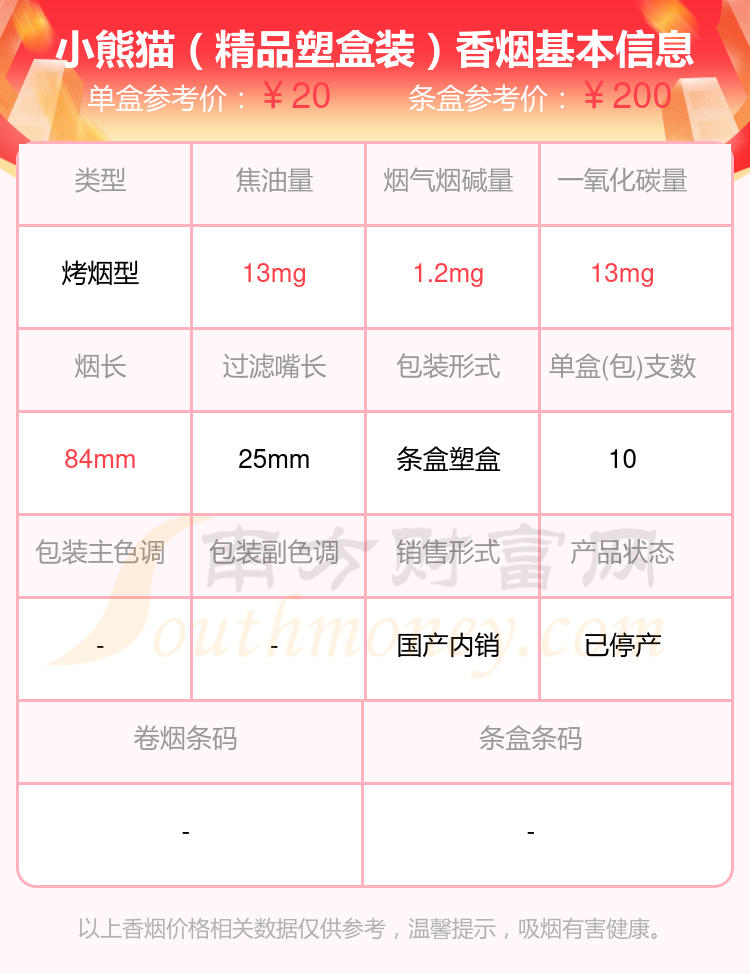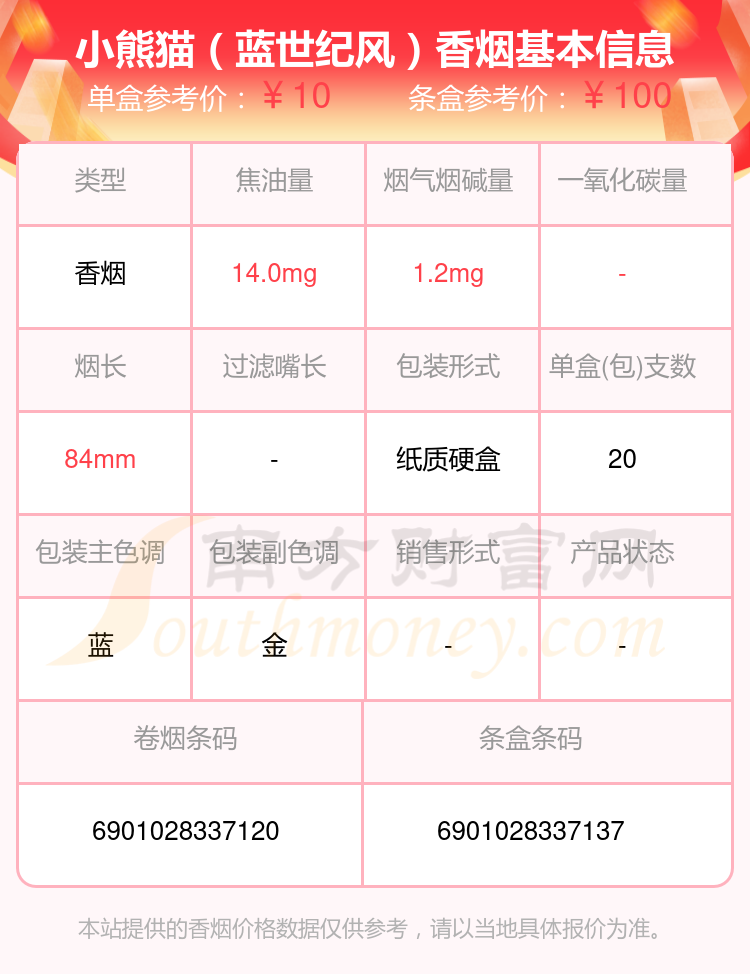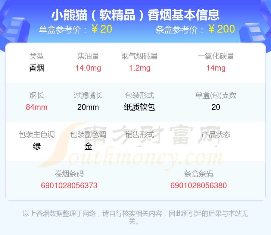 小熊貓(軟精品)參考價(jià)20.0元/包、小熊貓(清和風(fēng))參考價(jià)7.0元/包、小熊貓(綠精品)參考價(jià)20.0元/包、小熊貓(藍(lán)世紀(jì)風(fēng))參考價(jià)10.0元/包、小熊貓(軟藍(lán)世紀(jì)風(fēng))參考價(jià)10元/包、小熊貓(精品塑盒裝)參考價(jià)20元/包、小熊貓(紅世紀(jì)風(fēng))參考價(jià)10.0元/包、小熊貓(精品)參考價(jià)20.0元/包、小熊貓(精品出口AU)參考價(jià)78元/包、小熊貓(軟清和風(fēng))參考價(jià)8.0元/包等。