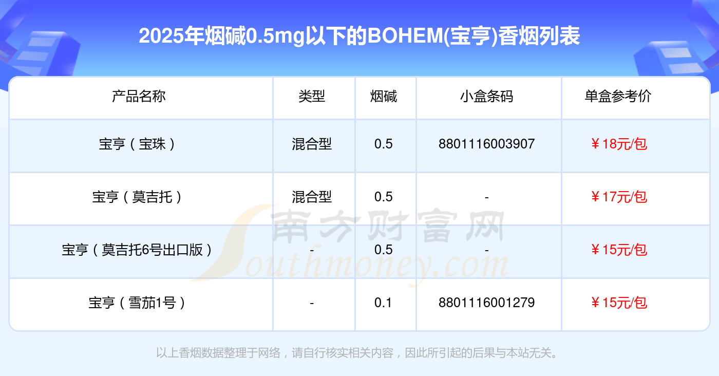 擇煙網為大家盤點了BOHEM(寶亨)香煙煙堿0.5mg以下的,分別有寶亨(寶珠)、寶亨(莫吉托)、寶亨(莫吉托6號出口版)、寶亨(雪茄1號)等,具體價格如下:
