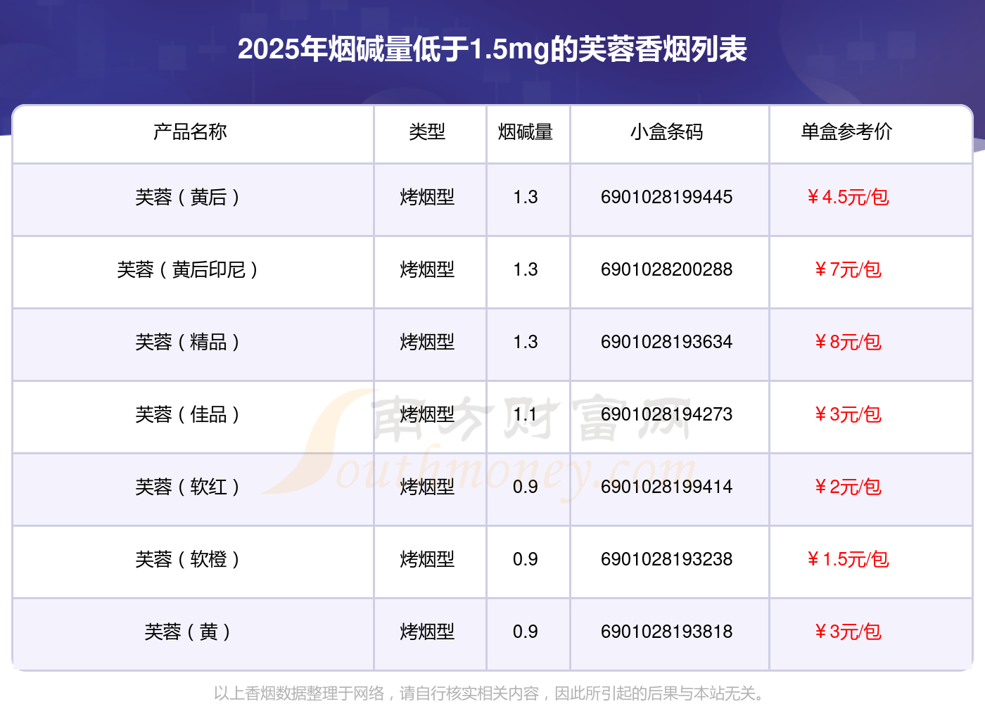 擇煙網(wǎng)為大家盤點(diǎn)了芙蓉香煙煙堿量低于1.5mg的,分別有芙蓉(黃后)、芙蓉(黃后印尼)、芙蓉(精品)、芙蓉(佳品)、芙蓉(軟紅)、芙蓉(軟橙)、芙蓉(黃)等,具體價(jià)格如下: