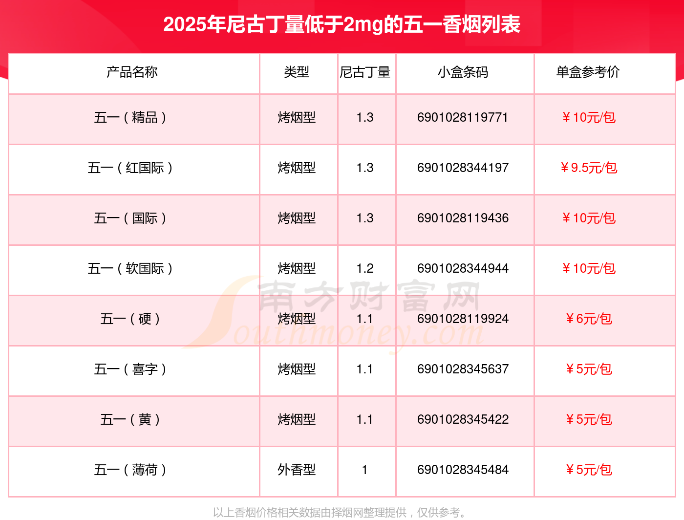 五一(精品)參考價10元/包、五一(紅國際)參考價9.5元/包、五一(國際)參考價10元/包、五一(軟國際)參考價10元/包、五一(硬)參考價6元/包、五一(喜字)參考價5元/包、五一(黃)參考價5元/包、五一(薄荷)參考價5元/包等。