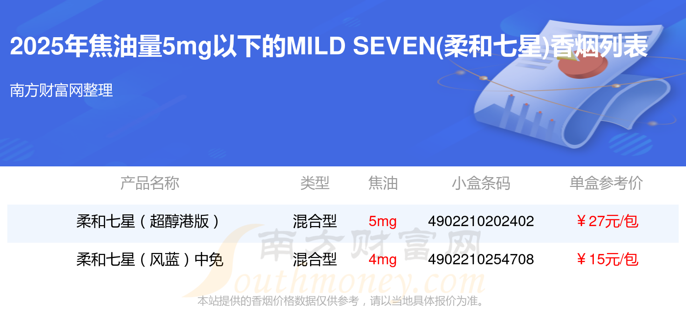 擇煙網(wǎng)為大家盤點(diǎn)了MILD SEVEN(柔和七星)香煙焦油量5mg以下的,分別有柔和七星(超醇港版)、柔和七星(風(fēng)藍(lán))中免等,具體價(jià)格如下: