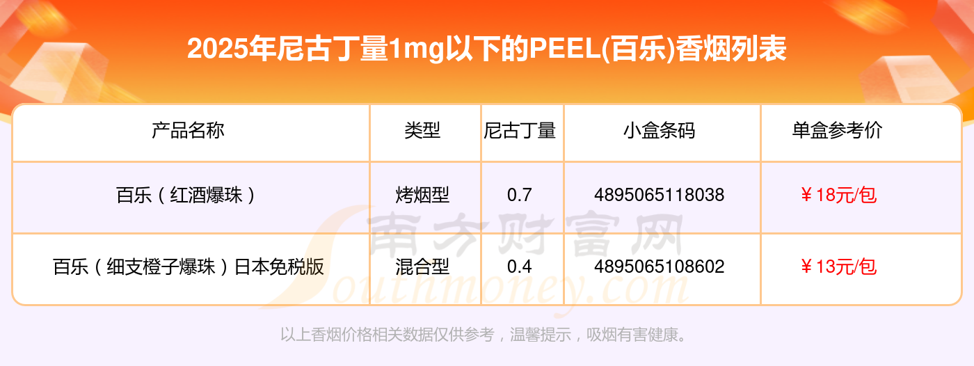 PEEL(百樂)香煙尼古丁量1mg以下的煙分別有百樂(紅酒爆珠)參考價18.0元/包、百樂(細支橙子爆珠)日本免稅版參考價13.0元/包等。