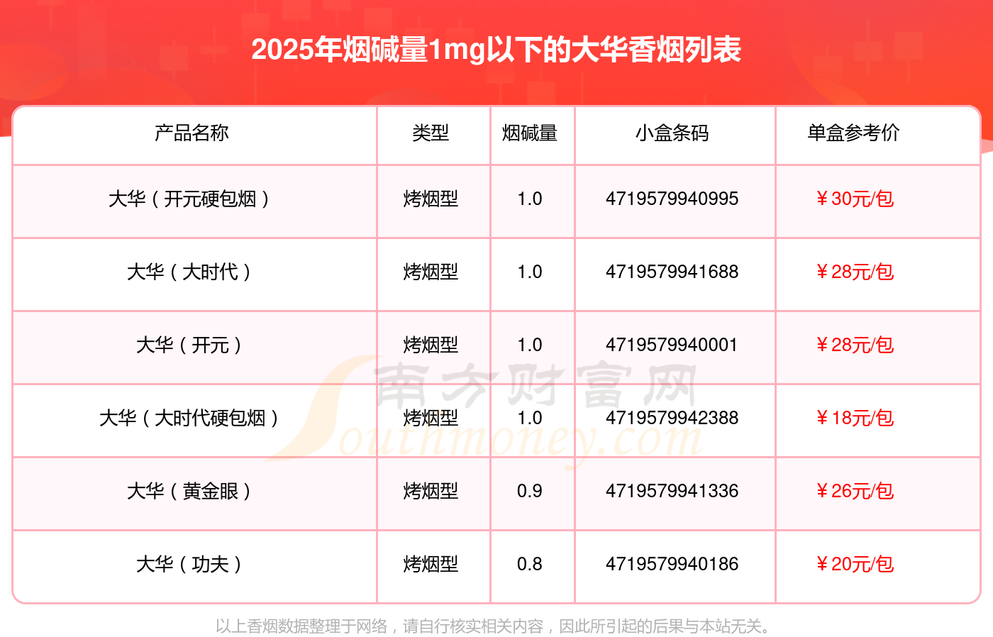大華香煙煙堿量1mg以下的煙有大華(開元硬包煙)、大華(大時代)、大華(開元)、大華(大時代硬包煙)、大華(黃金眼)、大華(功夫)等,詳細價格如下: