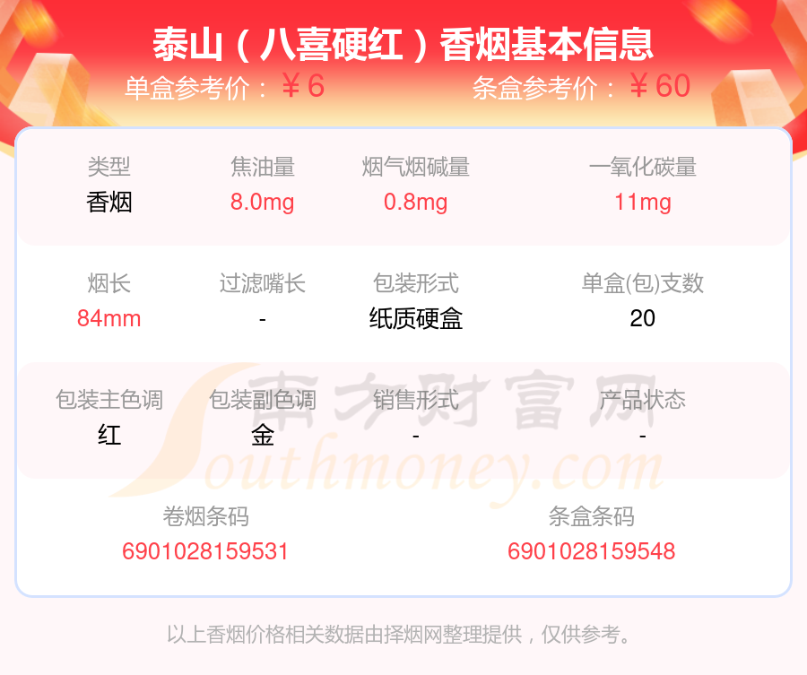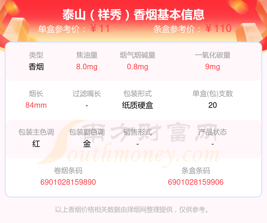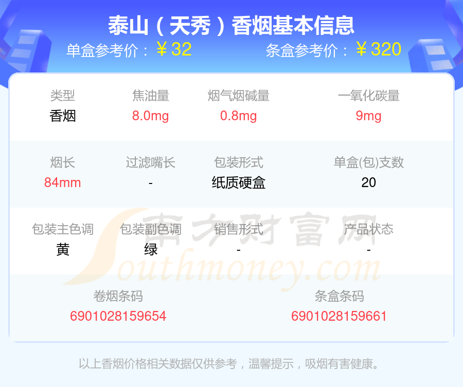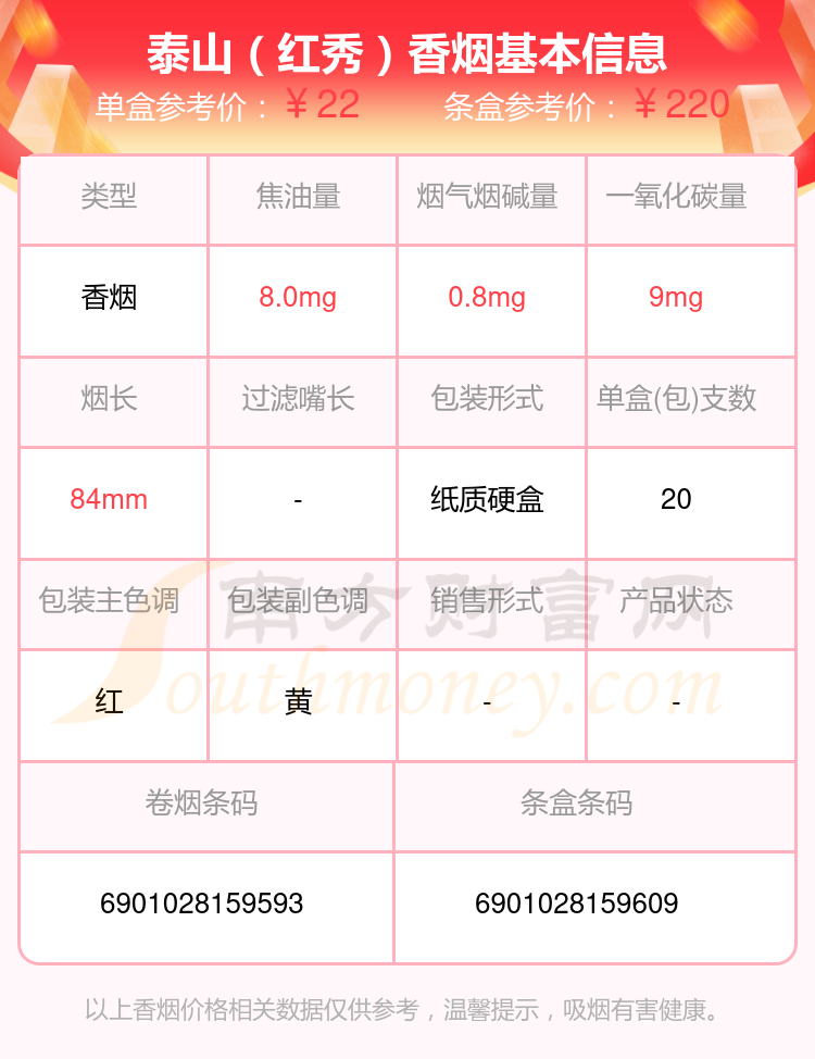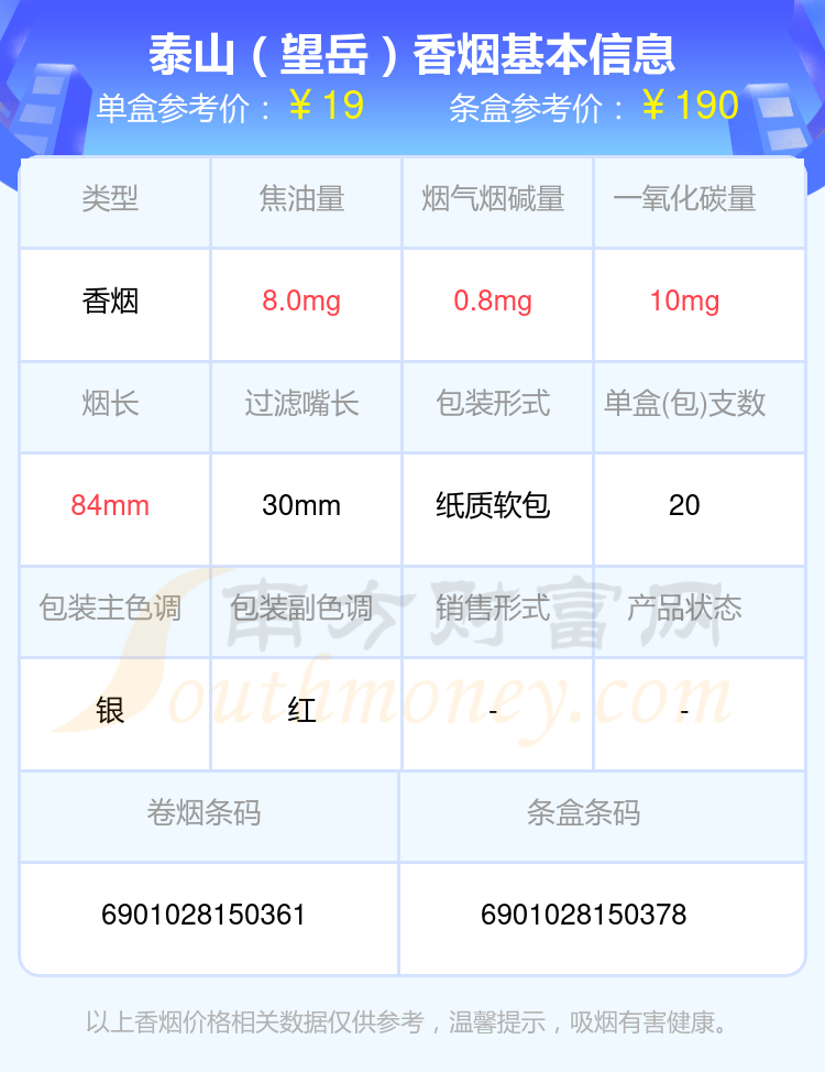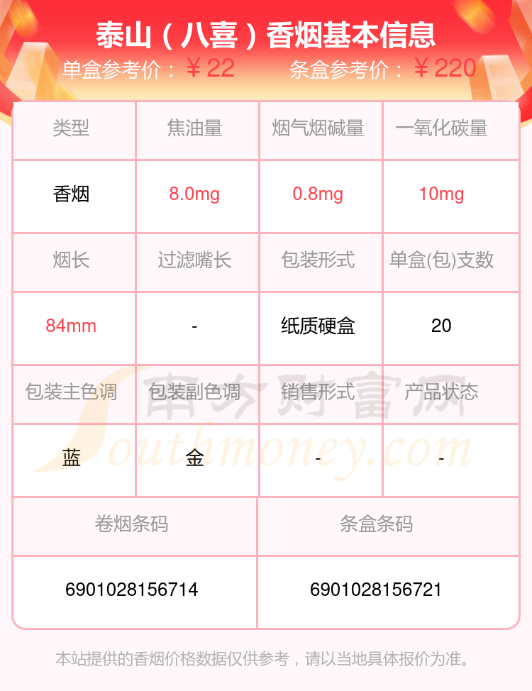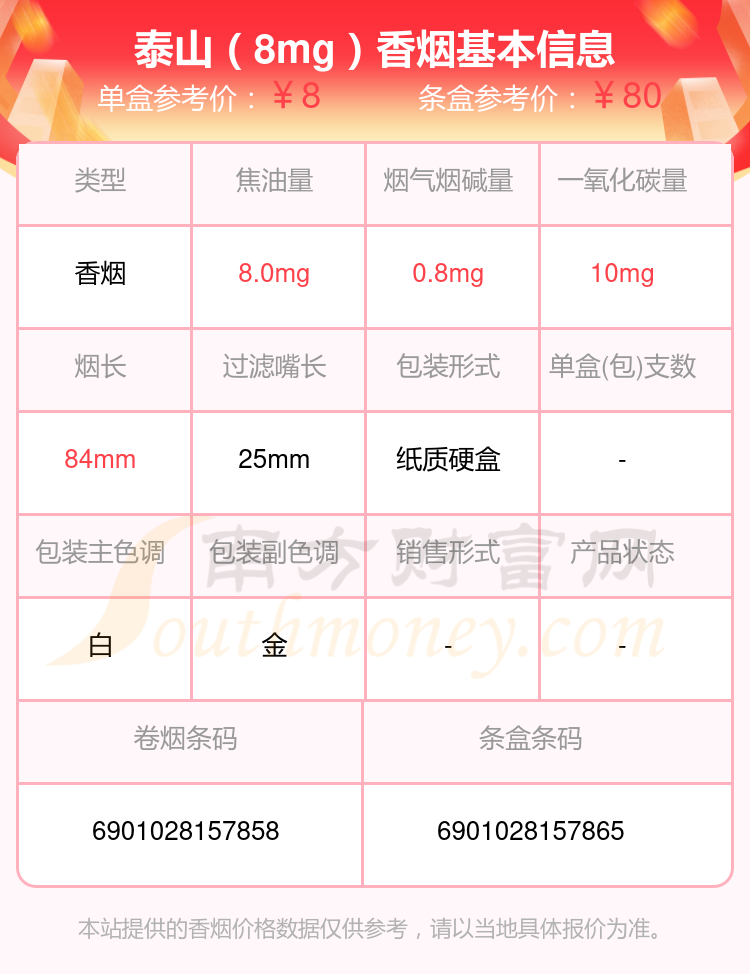 泰山(八喜)參考價(jià)22.0元/包、泰山(八喜臨門(mén))參考價(jià)18.0元/包、泰山(望岳)參考價(jià)19.0元/包、泰山(錦秀)參考價(jià)16.0元/包、泰山(天秀)參考價(jià)32.0元/包、泰山(紅秀)參考價(jià)22.0元/包、泰山(新東方)參考價(jià)14.0元/包、泰山(祥秀)參考價(jià)11.0元/包、泰山(8mg)參考價(jià)8.0元/包、泰山(八喜硬紅)參考價(jià)6.0元/包等。