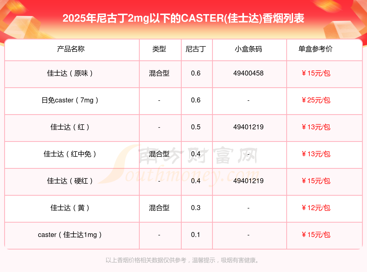 尼古丁2mg以下的CASTER(佳士達)香煙有哪些?擇煙網(wǎng)為大家整理盤點,有佳士達(原味)、日免caster(7mg)、佳士達(紅)、佳士達(紅中免)、佳士達(硬紅)、佳士達(黃)、caster(佳士達1mg)等,詳細價格如下: