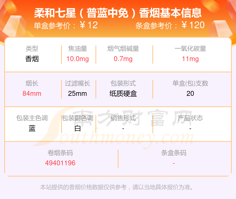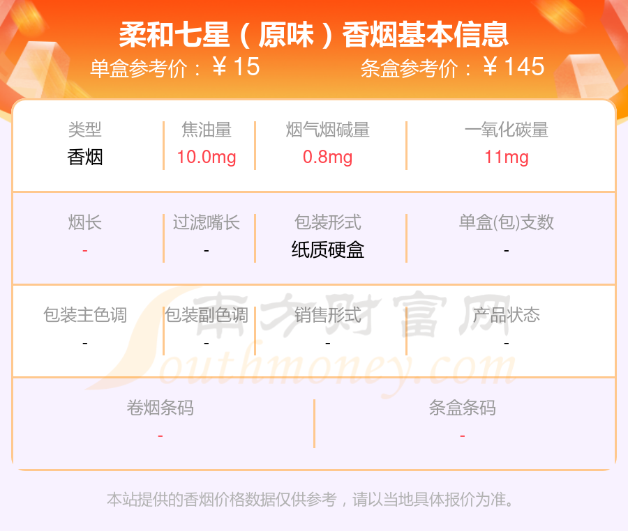 MILD SEVEN(柔和七星)香煙焦油量8mg至15mg的煙分別有柔和七星(天藍(lán))煙草版參考價(jià)15.0元/包、柔和七星(10mg)參考價(jià)15.0元/包、柔和七星(普藍(lán)中免)參考價(jià)12.0元/包、柔和七星(原味)參考價(jià)15.0元/包、柔和七星(國(guó)際寬中免)參考價(jià)8.0元/包等。