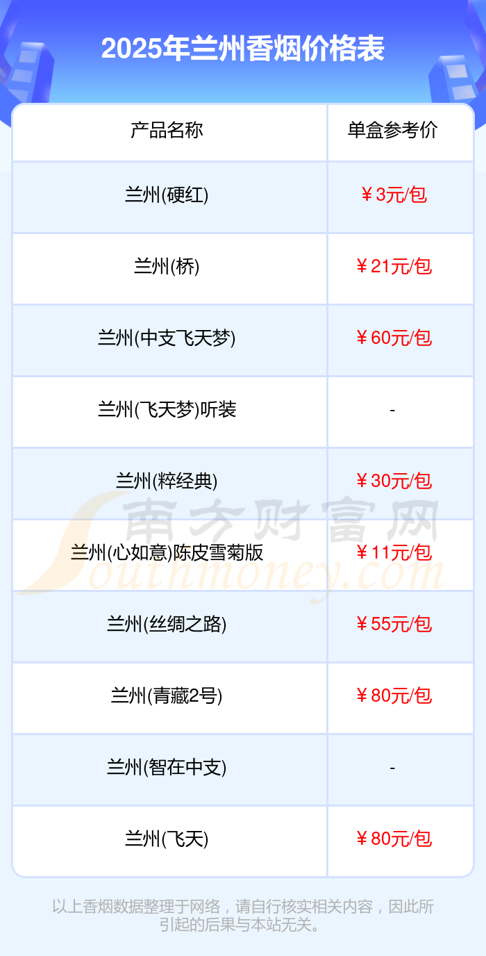 蘭州香煙最新價(jià)格2025:蘭州(青藏1號(hào))參考價(jià)100.0元/包、蘭州(飛天夢)參考價(jià)100.0元/包、蘭州(青藏2號(hào))參考價(jià)80.0元/包、蘭州(飛天)參考價(jià)80.0元/包、蘭州(細(xì)支飛天夢)參考價(jià)65.0元/包、蘭州(中支飛天夢)參考價(jià)60.0元/包。