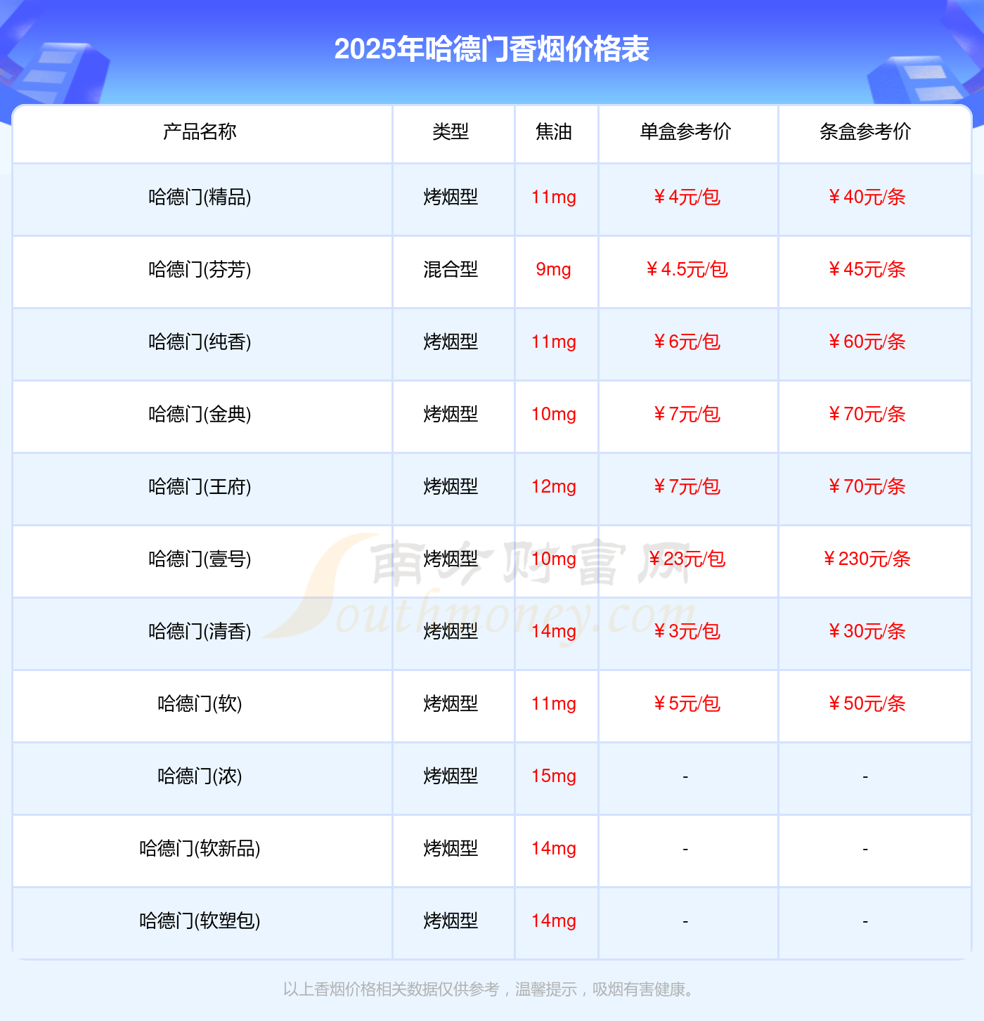 2025哈德門(mén)香煙最新價(jià)格:哈德門(mén)(壹號(hào))參考價(jià)230.0元/條、哈德門(mén)(金典)參考價(jià)70.0元/條、哈德門(mén)(王府)參考價(jià)70.0元/條、哈德門(mén)(純香)參考價(jià)60.0元/條、哈德門(mén)(軟)參考價(jià)50.0元/條。