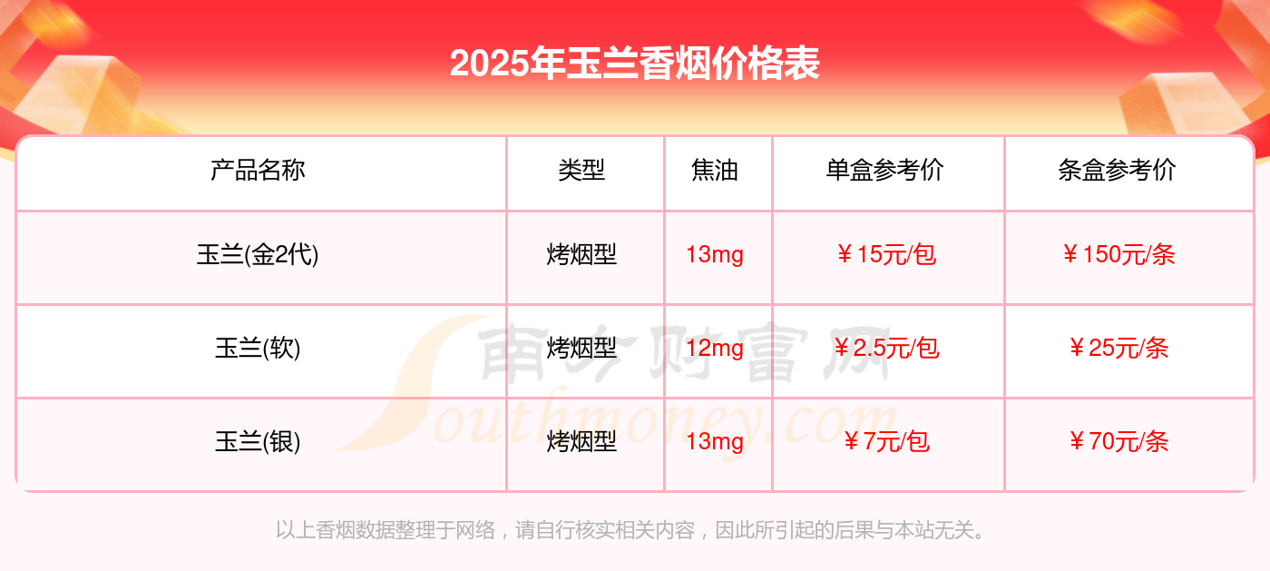 2025年,玉蘭(金2代)、玉蘭(銀)、玉蘭(軟)等玉蘭香煙價格如下: