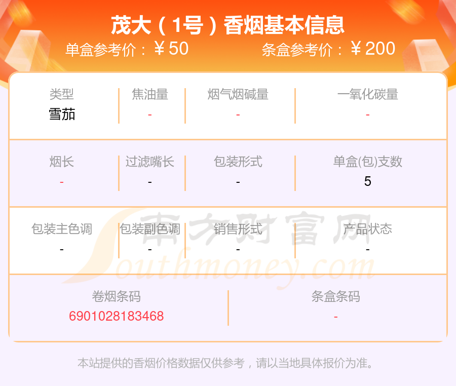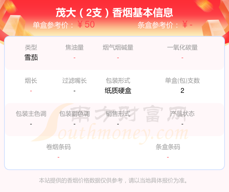 茂大香煙50元~60元左右的煙有茂大(2支)、茂大(1號(hào))等,詳細(xì)價(jià)格如下: