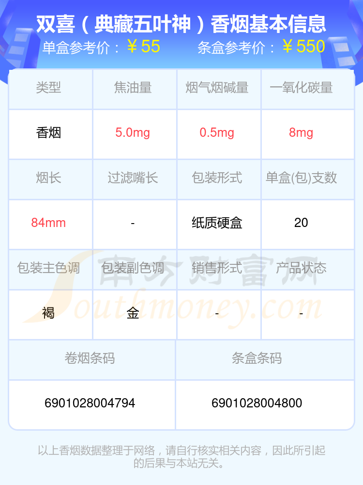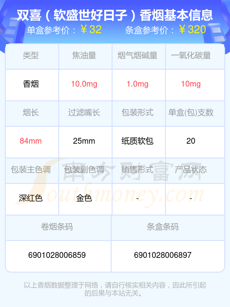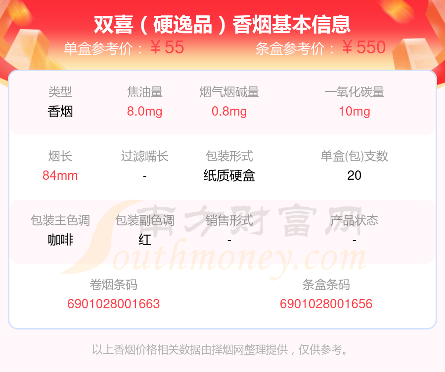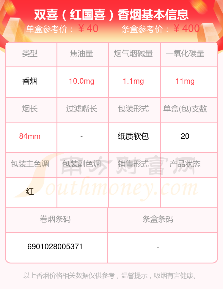雙喜(典藏五葉神)參考價55.0元/包、雙喜(硬逸品)參考價55.0元/包、雙喜(萬象好日子)參考價50.0元/包、雙喜(硬珍藏)參考價46.0元/包、雙喜(國喜細(xì)支)參考價40.0元/包、雙喜(紅國喜)參考價40.0元/包、雙喜(細(xì)支金樽好日子)參考價34.0元/包、雙喜(軟紅五葉神)舊版參考價33.0元/包、雙喜(軟紅五葉神)參考價33.0元/包、雙喜(軟盛世好日子)參考價32.0元/包等。