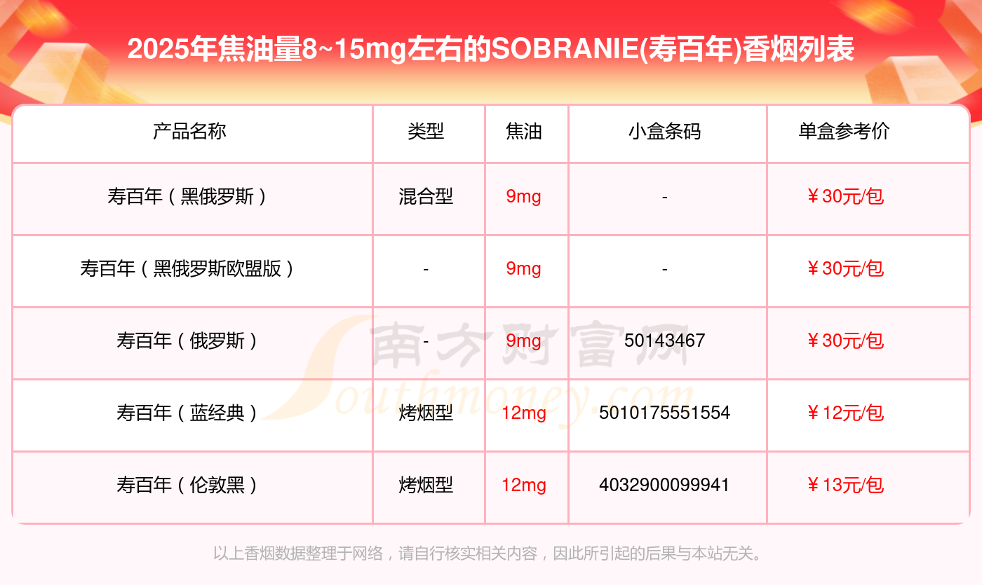 擇煙網(wǎng)為大家盤點了焦油量8~15mg左右的SOBRANIE(壽百年)香煙,分別有壽百年(黑俄羅斯)、壽百年(黑俄羅斯歐盟版)、壽百年(俄羅斯)、壽百年(藍經(jīng)典)、壽百年(倫敦黑)等,具體價格如下: