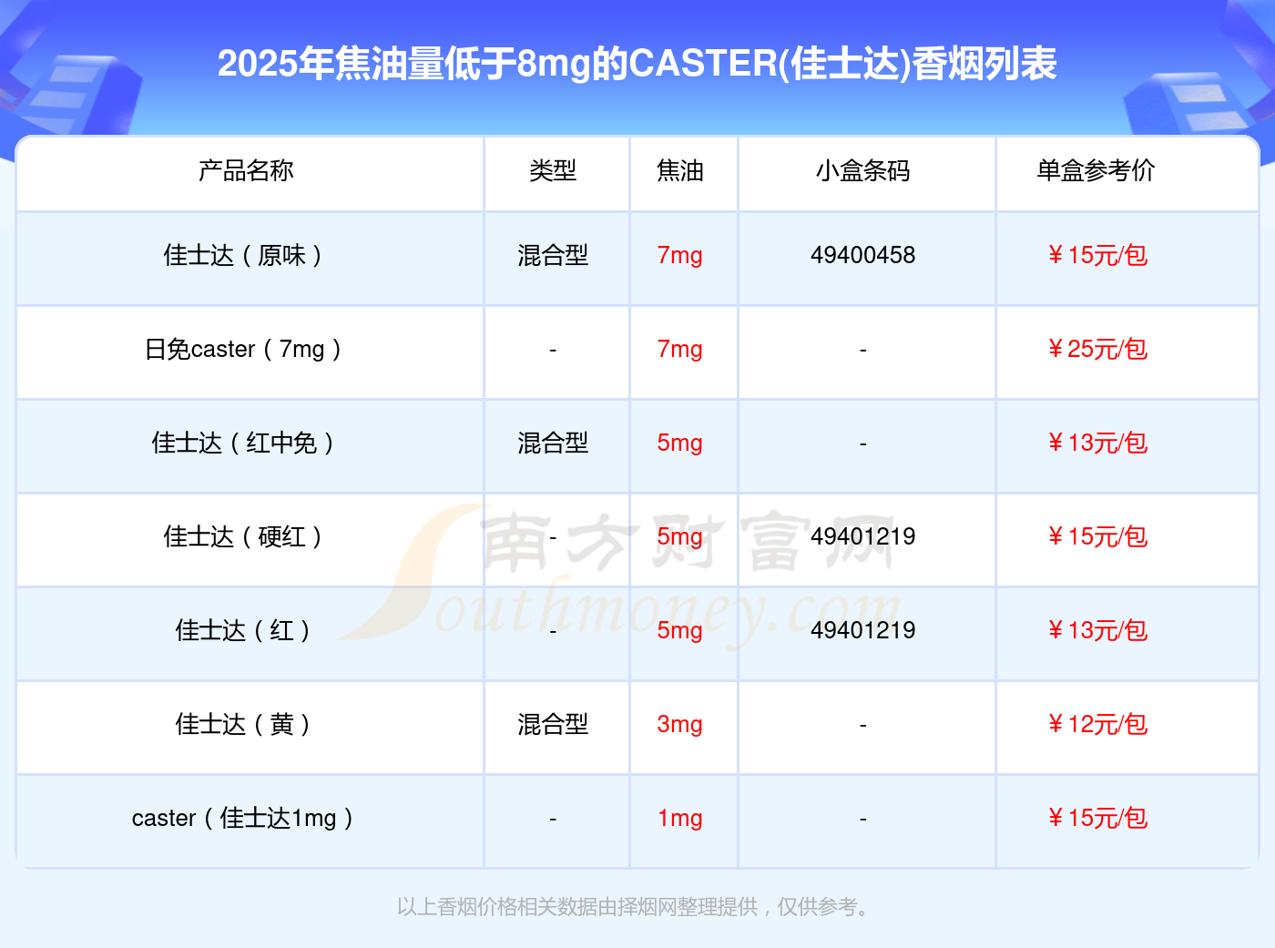 CASTER(佳士達(dá))香煙焦油量低于8mg的有哪些?擇煙網(wǎng)為大家整理提供,分別有: