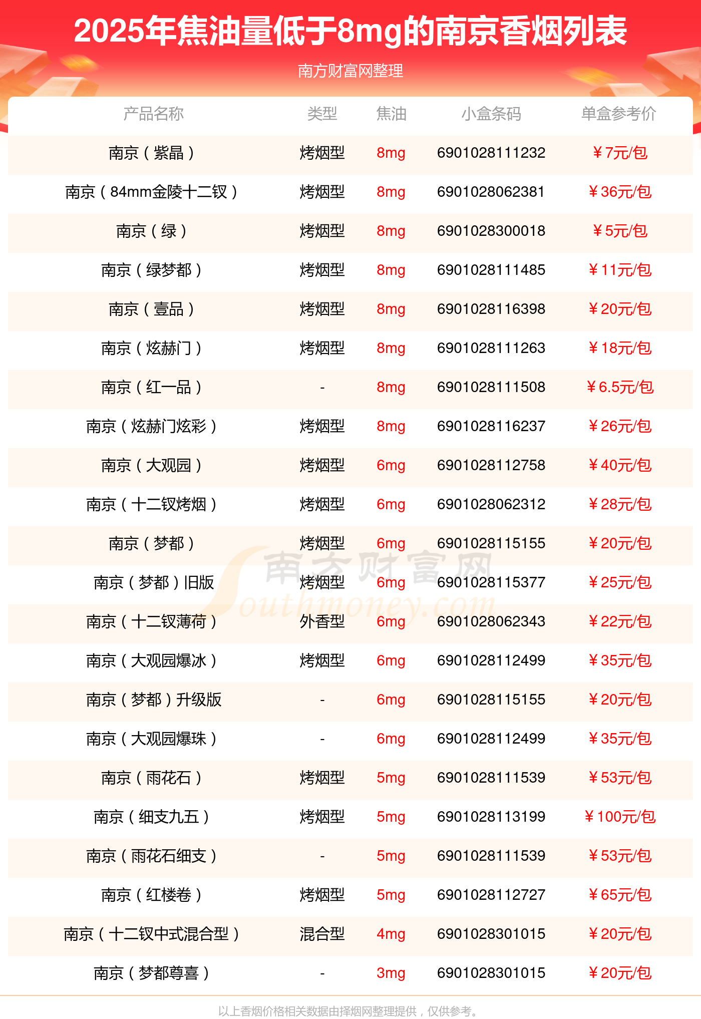 南京香煙焦油量低于8mg的煙有哪些?擇煙網(wǎng)為大家整理提供,分別有:南京(紫晶)、南京(84mm金陵十二釵)、南京(綠)、南京(綠夢(mèng)都)、南京(壹品)、南京(炫赫門(mén))、南京(紅一品)、南京(炫赫門(mén)炫彩)、南京(大觀園)、南京(十二釵烤煙)等,具體價(jià)格如下: